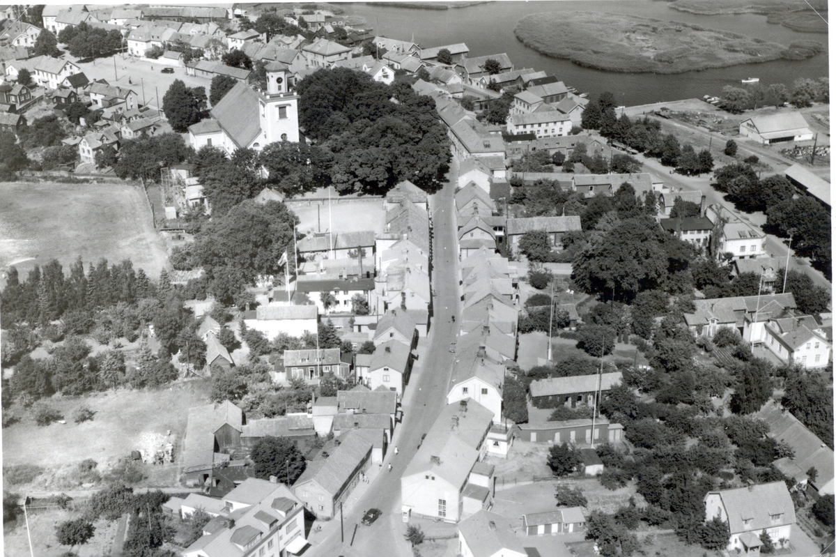 Flygbild av Mönsterås med bostadshus och villor, kyrkan Kalmarsund i bakkant på bilden.