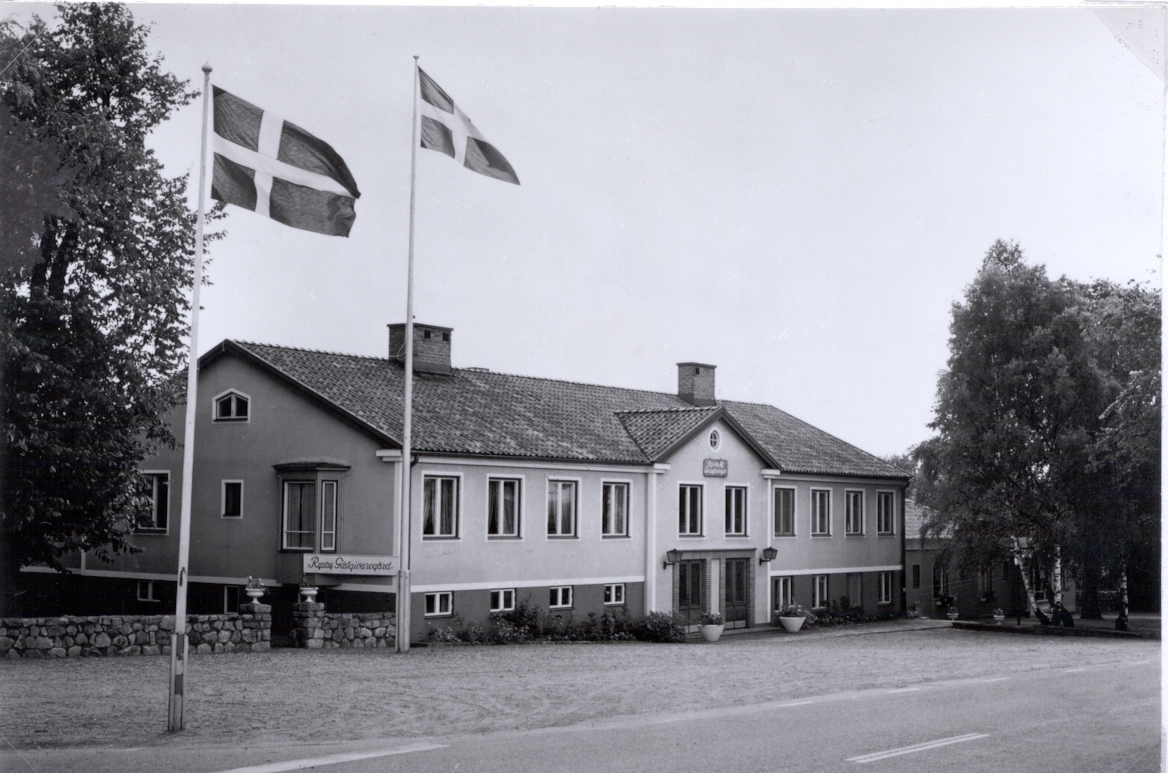 Bilden visar gästgiveriet i Rockneby från nordväst och är använd för ett kolorerat flerbildskort från Rockneby (se KLMF.L-C00007). Förmodligen är bilden från mitten eller senare hälften av 1960-talet.