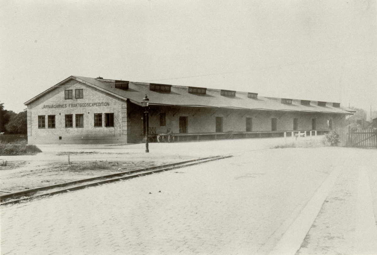 SJ:s godsmagasin. Skylt på godsmagasinets gavel: "JÄRNVÄGARNES FRAKTGODSXPEDITION".