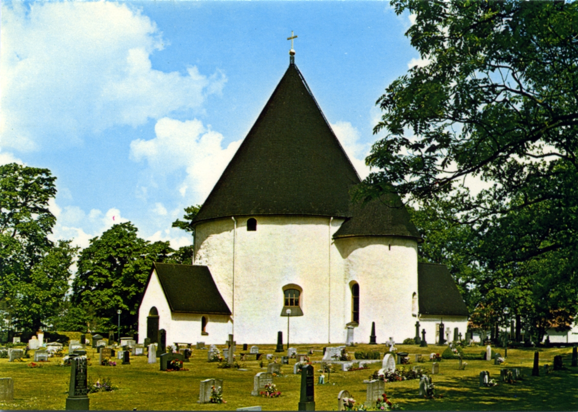 Titel: Vykort med motiv av rundkyrkan i Hagby.