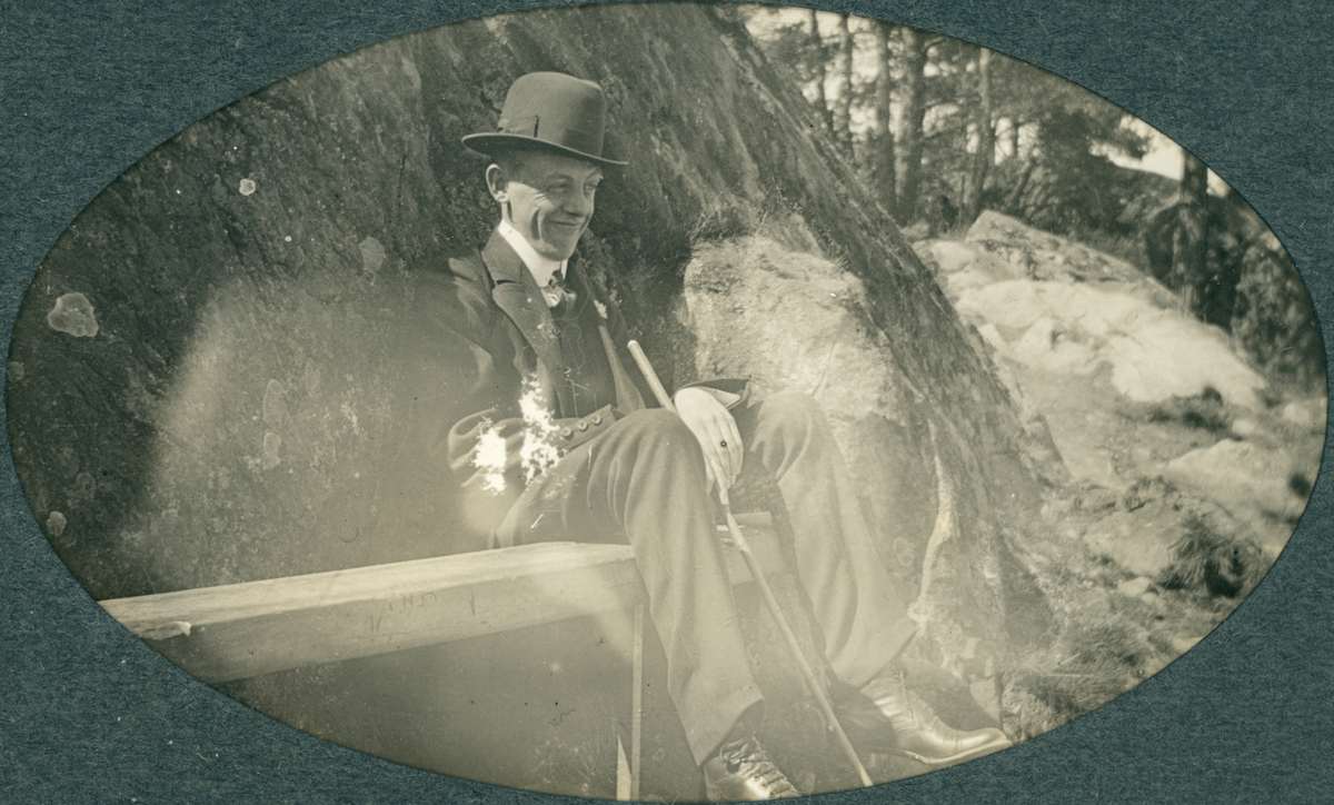 Man som sitter på en bänk. Troligen Dalbobergen