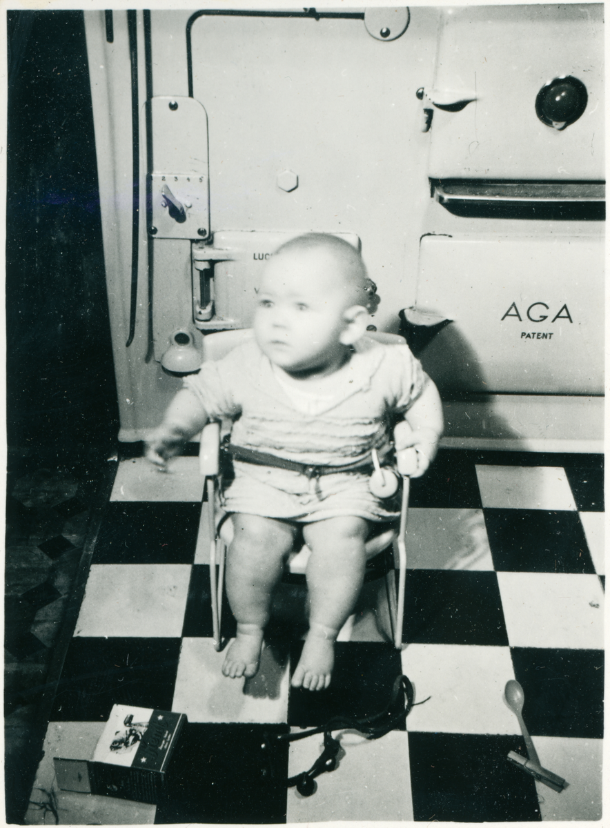 Torborg Nyström i kök med rutigt golv och AGA-spis