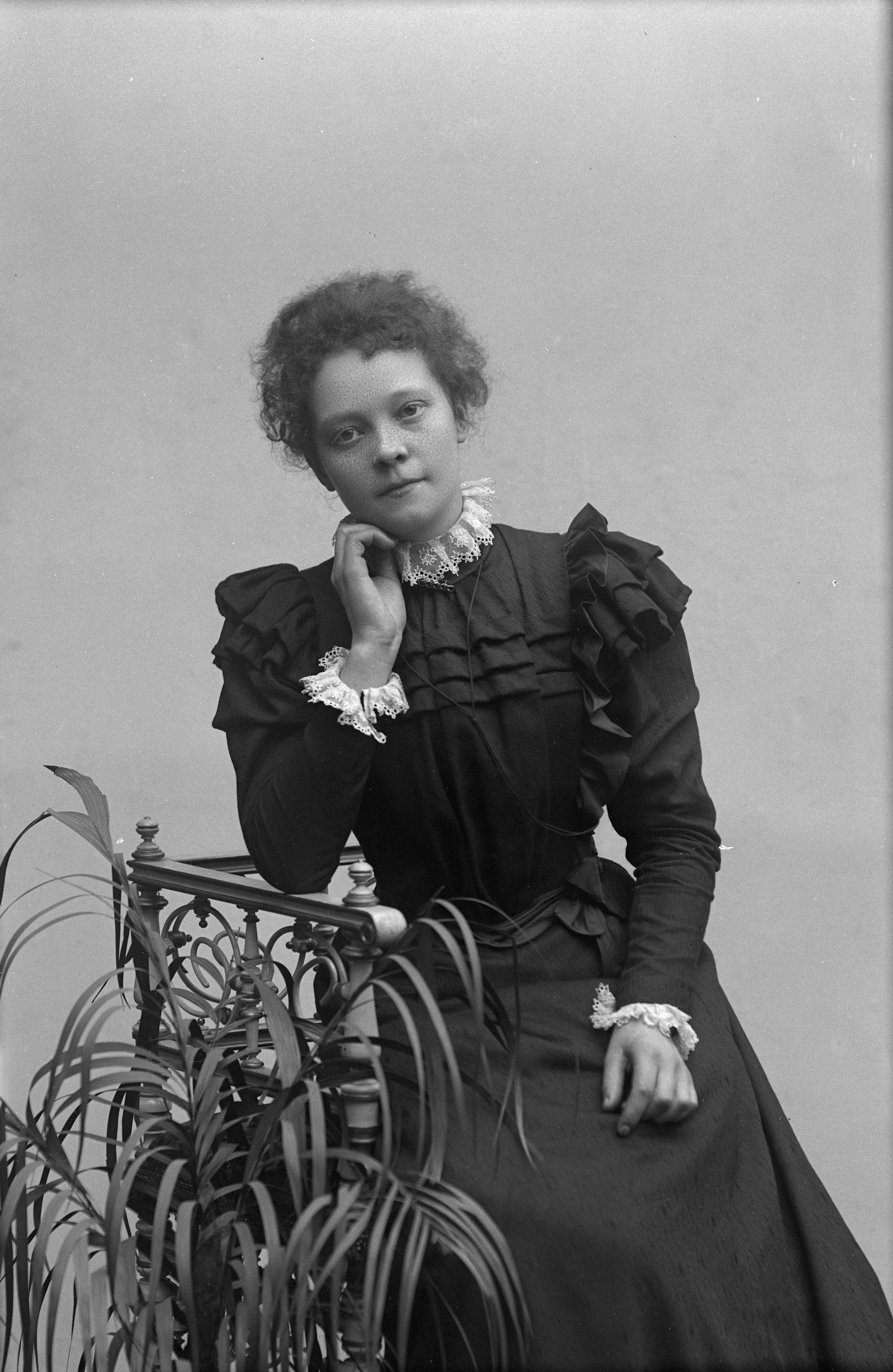 Porträtt i helfigur av Tekla Lindquist, sittande i stol, bredvid växt.