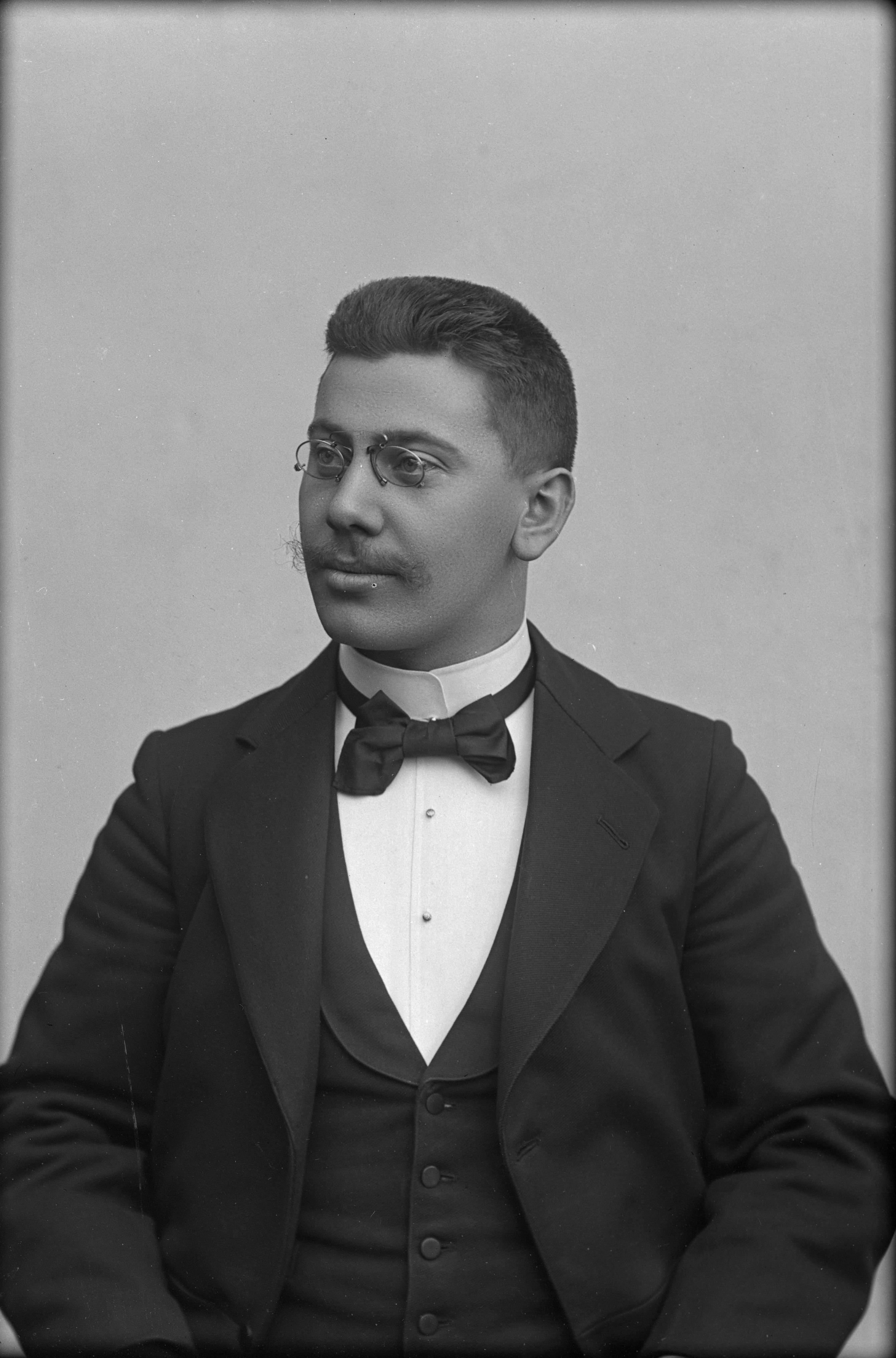 Beskrivning: Porträtt i halvfigur av bokhållare John Åkerlind vid Gummiaktiebolaget Velox.