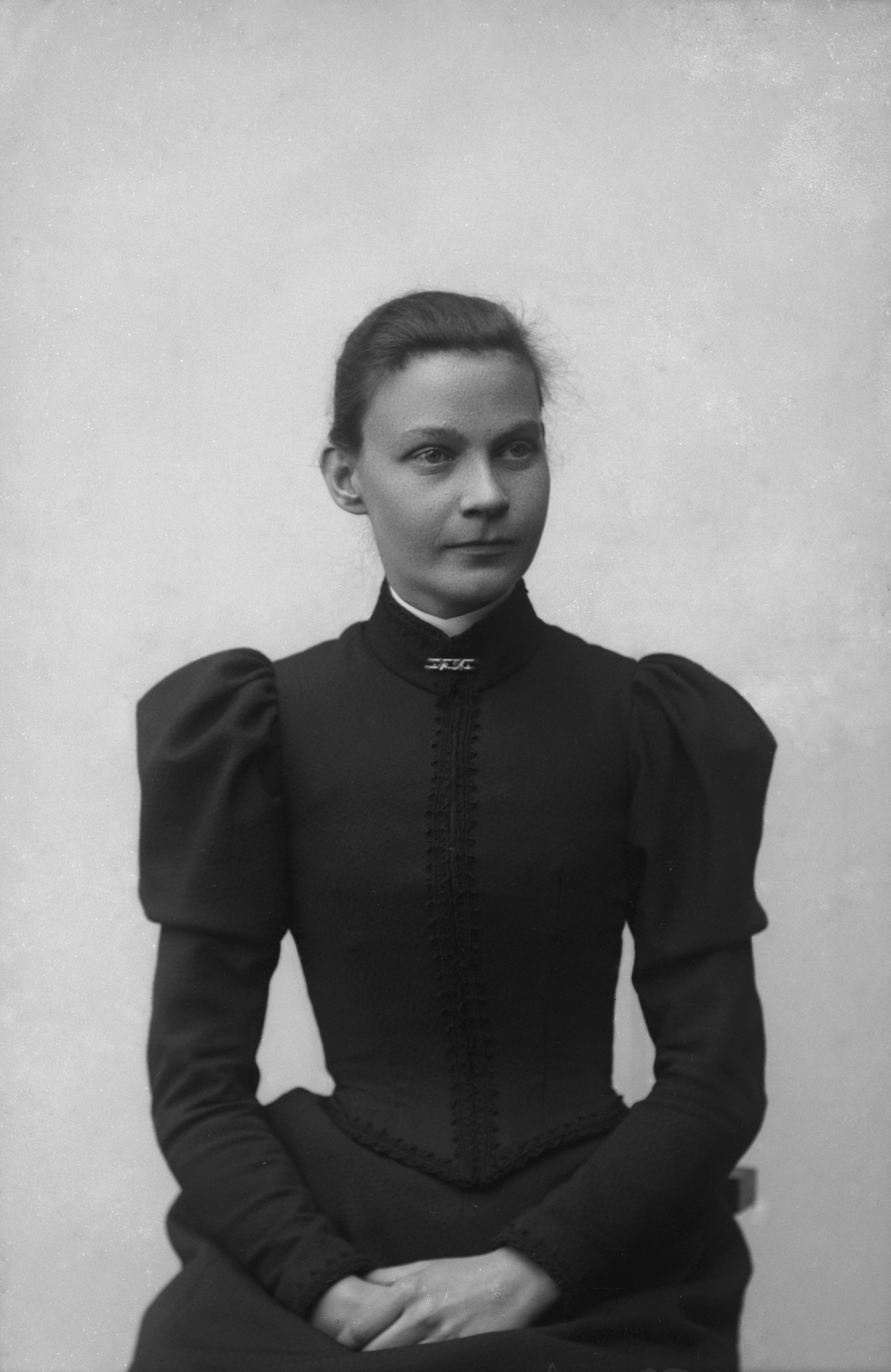 Beskrivning: Porträtt i halvfigur av Johanna Sörensson.