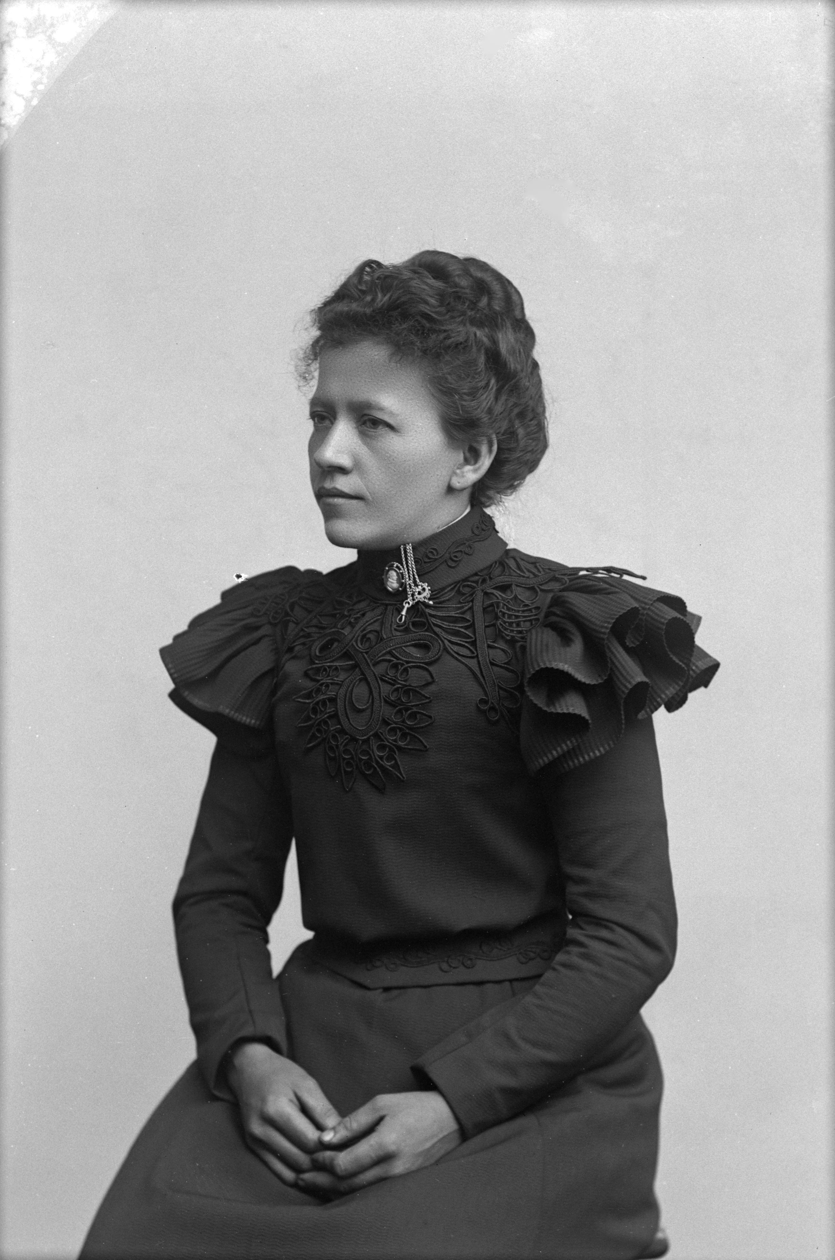 Beskrivning: Porträtt i halvfigur av Olivia Nordquist vid Sjöbo järnvägshotell.