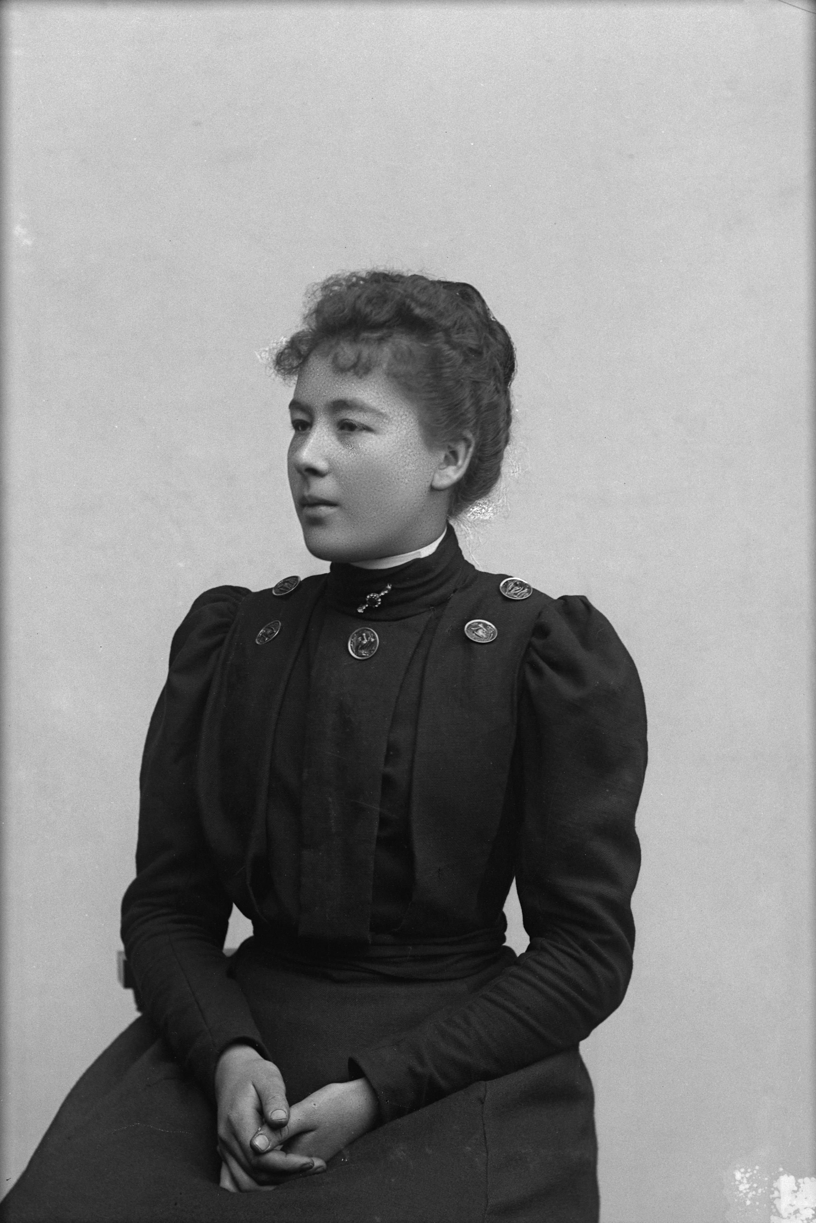 Beskrivning: Porträtt i halvfigur av Karin Mårtensson.