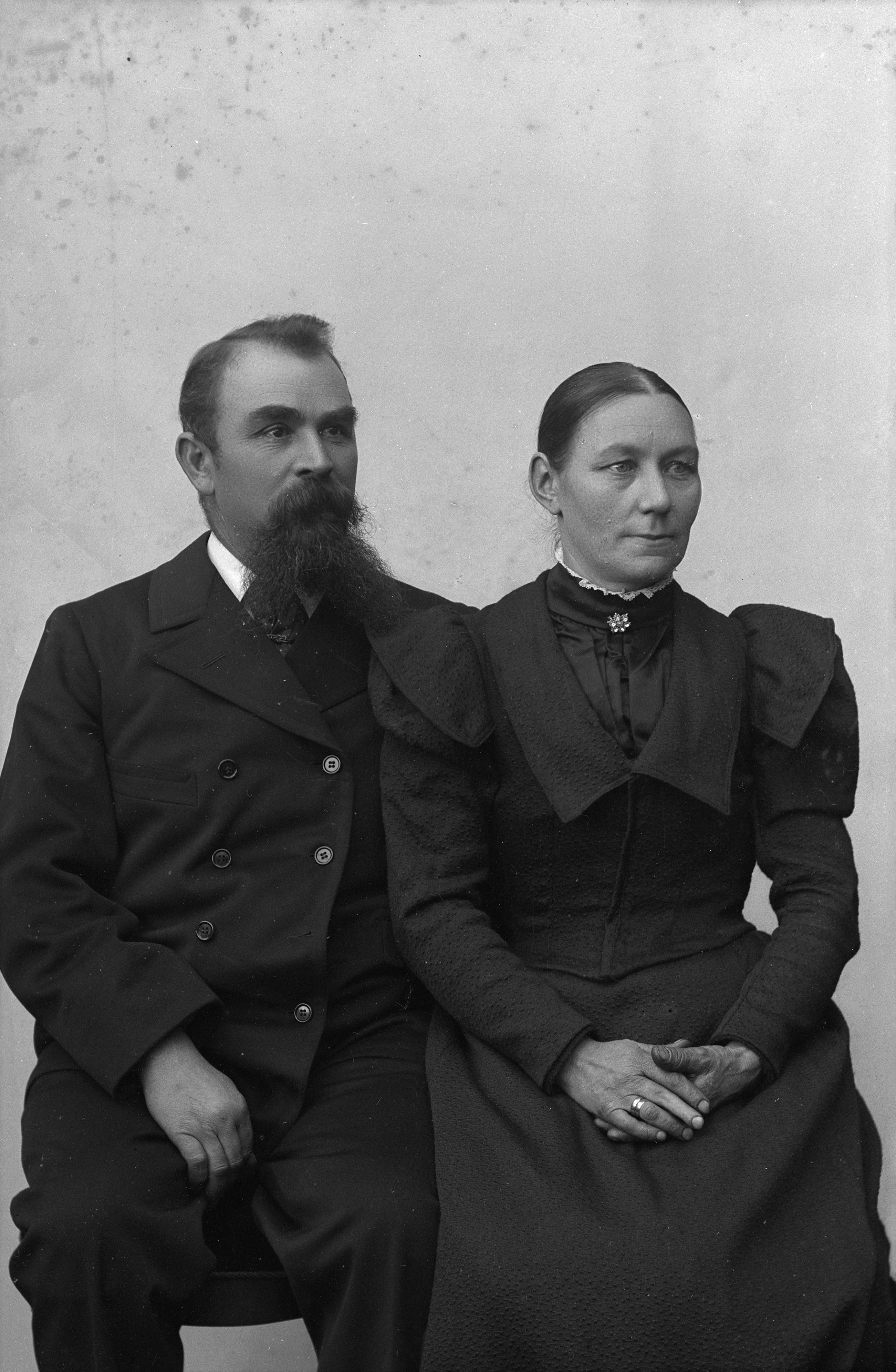 Beskrivning: Porträtt i helfigur av herr Palmquist med fru.