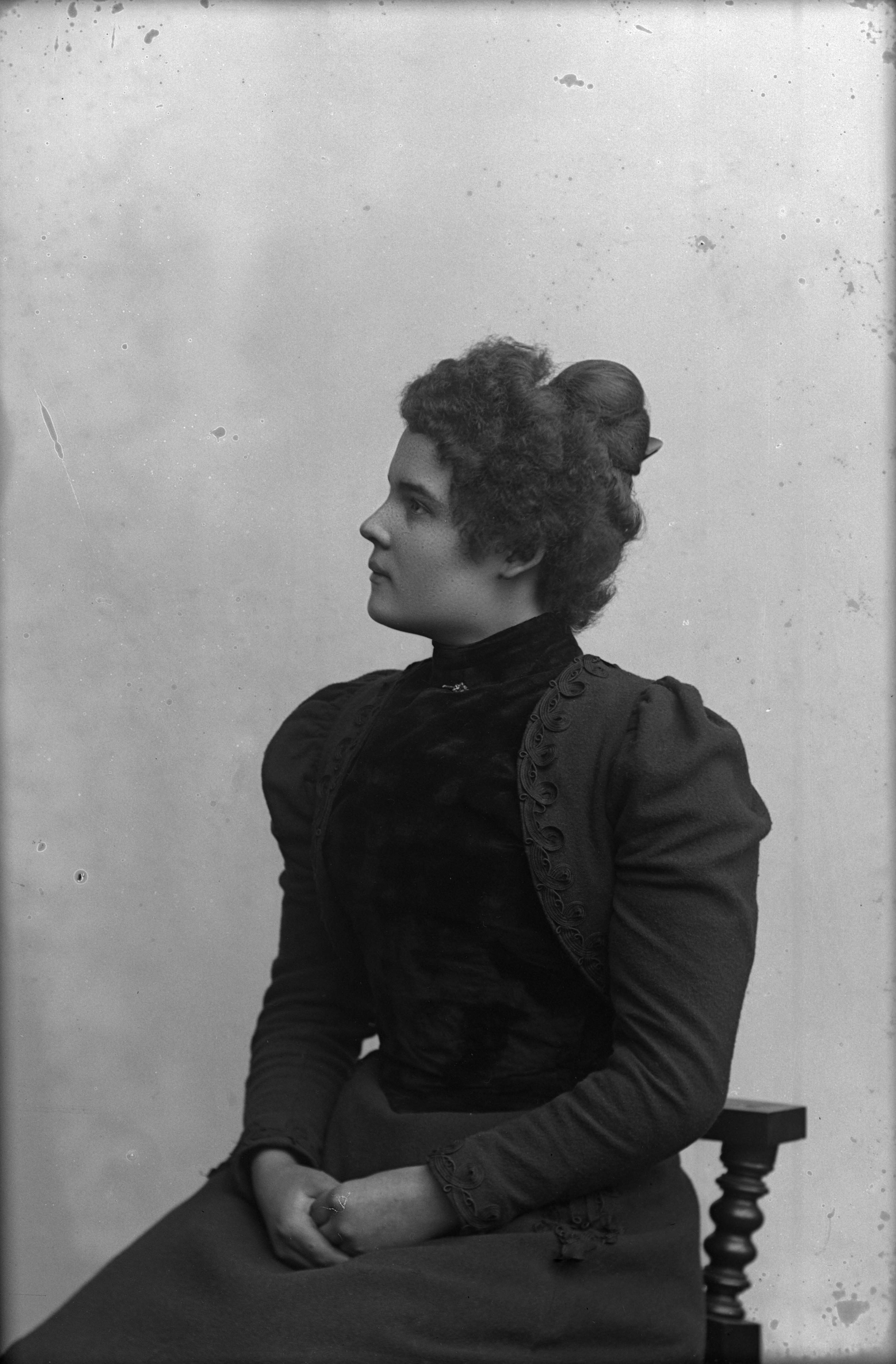 Porträtt i halvfigur av Ida Norberg, född Raaum, ansikte i profil.