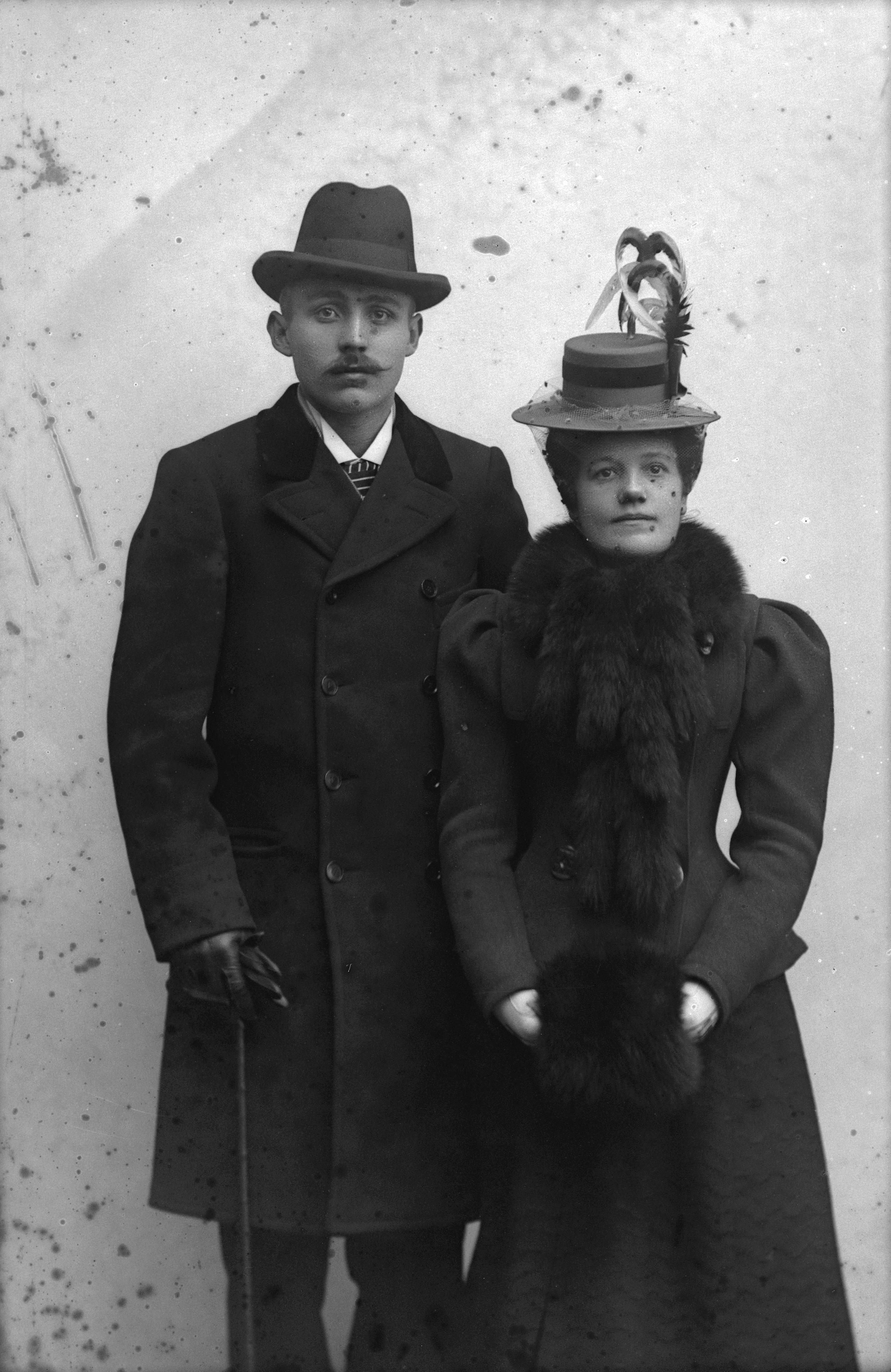 Porträtt i helfigur av typograf Edvin Hall och Albertina Askengren, tvätterksa, båda iklädda hattar och ytterplagg. Hon hållande handmuff i päls, han hållande käpp.