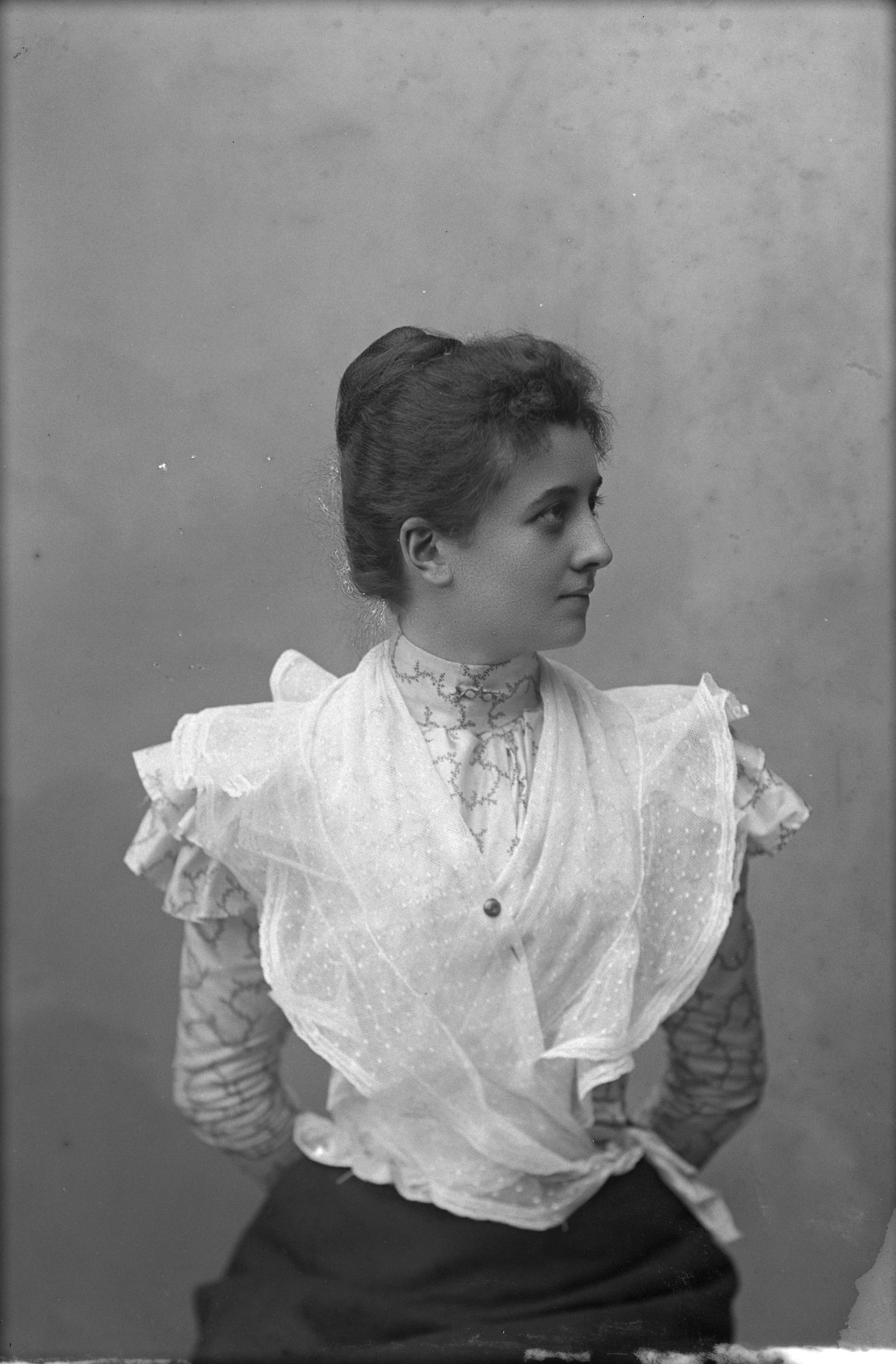Porträtt i halvfigur av fröken Luthander, ansikte i profil.