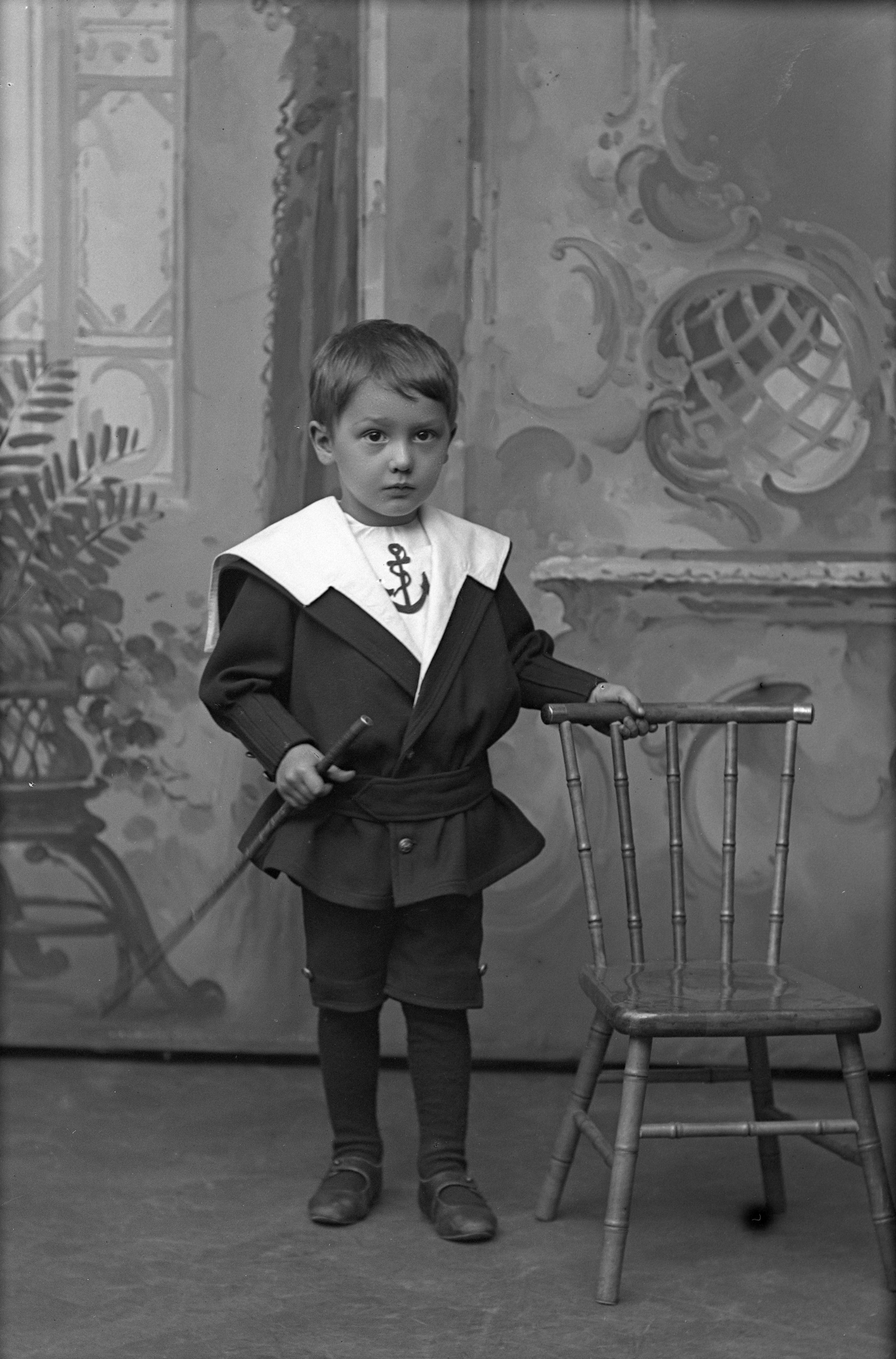 Porträtt helfigur av Lindgrens son, iklädd sjömanskostym, stående vid stol, hållande käpp /Eslöv.
