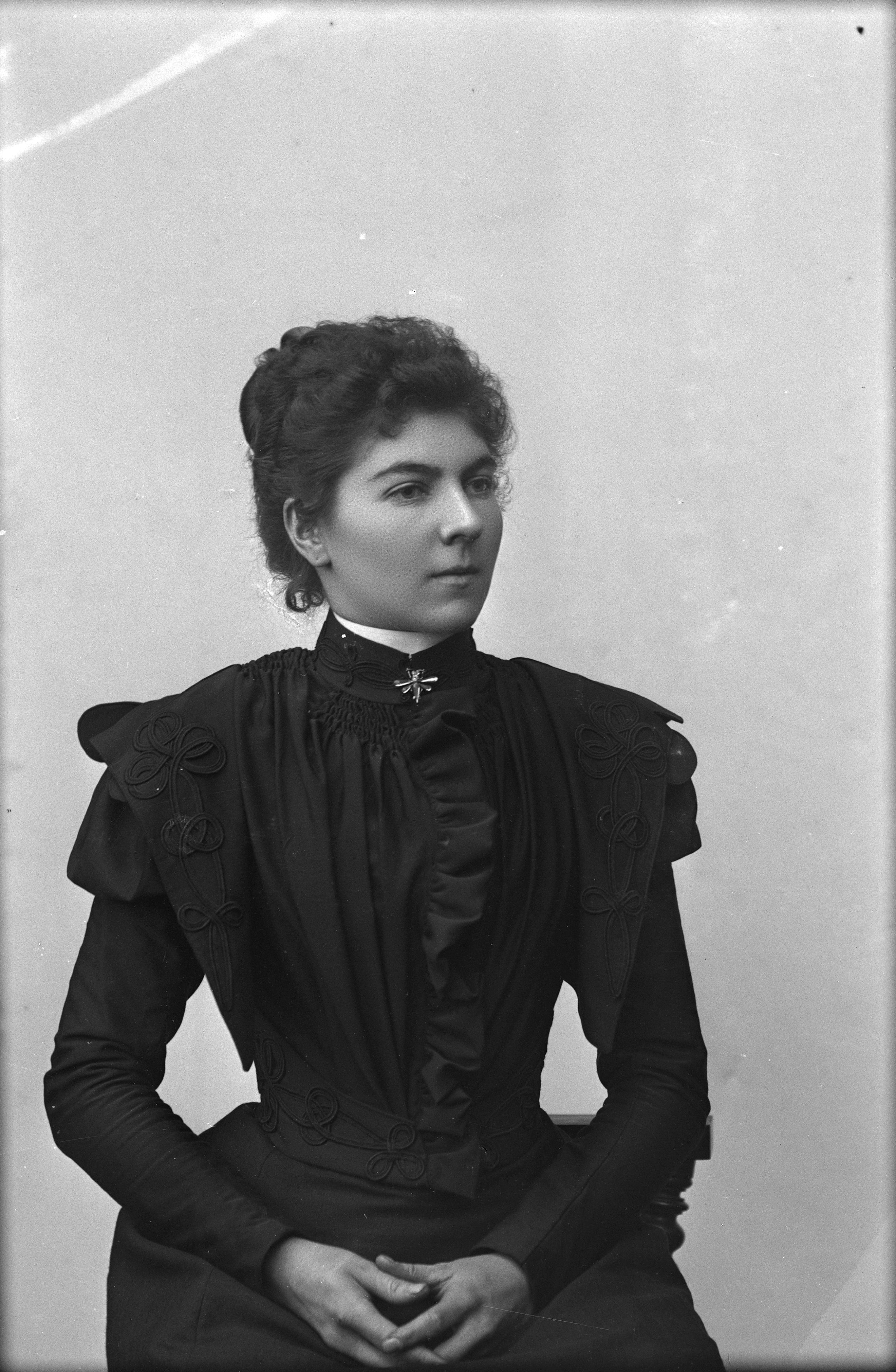Porträtt i halvfigur av fröken Ahlgren, bärande brosch i form av en trollslända.