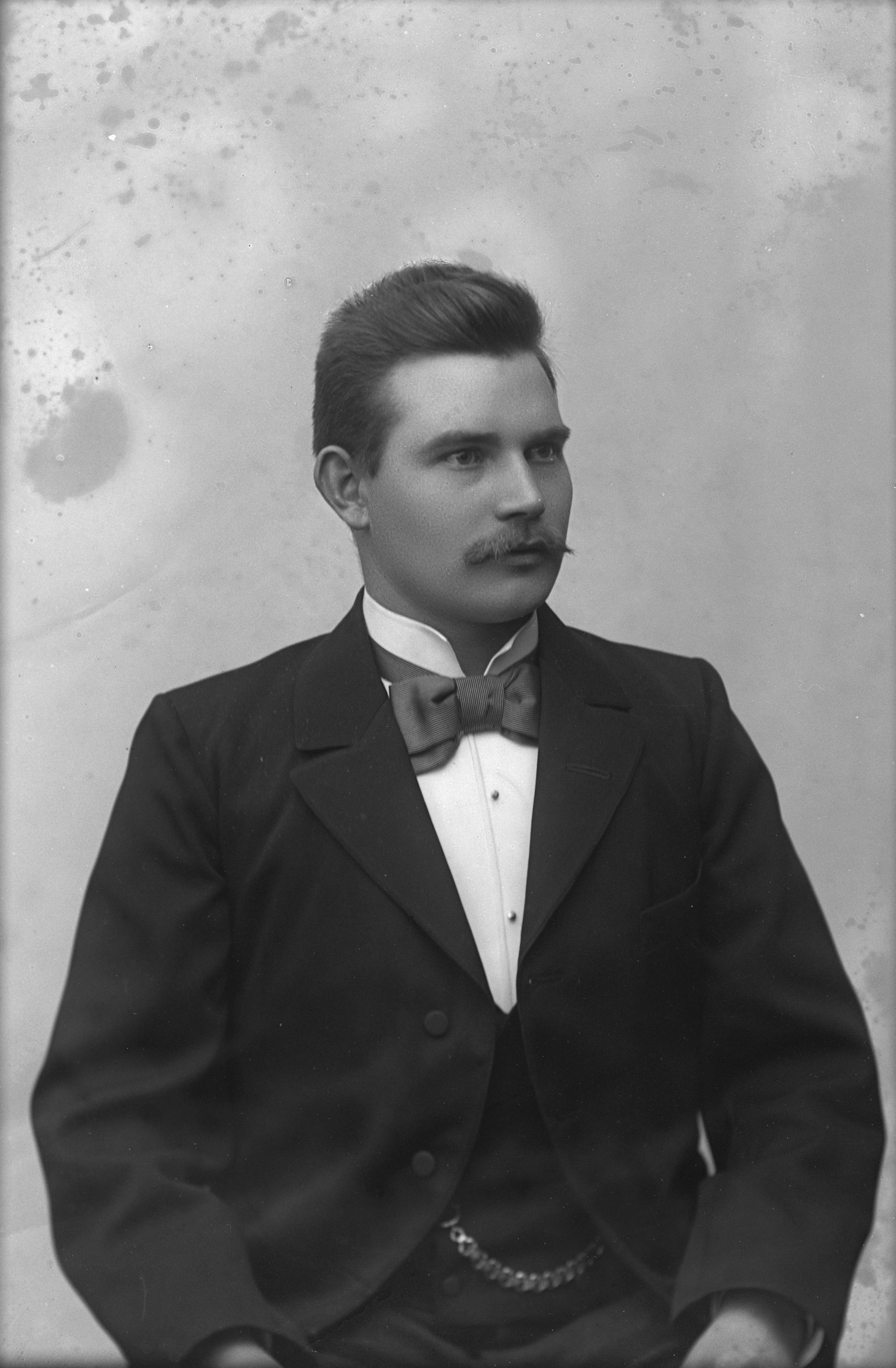 Beskrivning: Porträtt i halvfigur av kontorist Rosengren vid Staffanstorps Snickerifabrik.