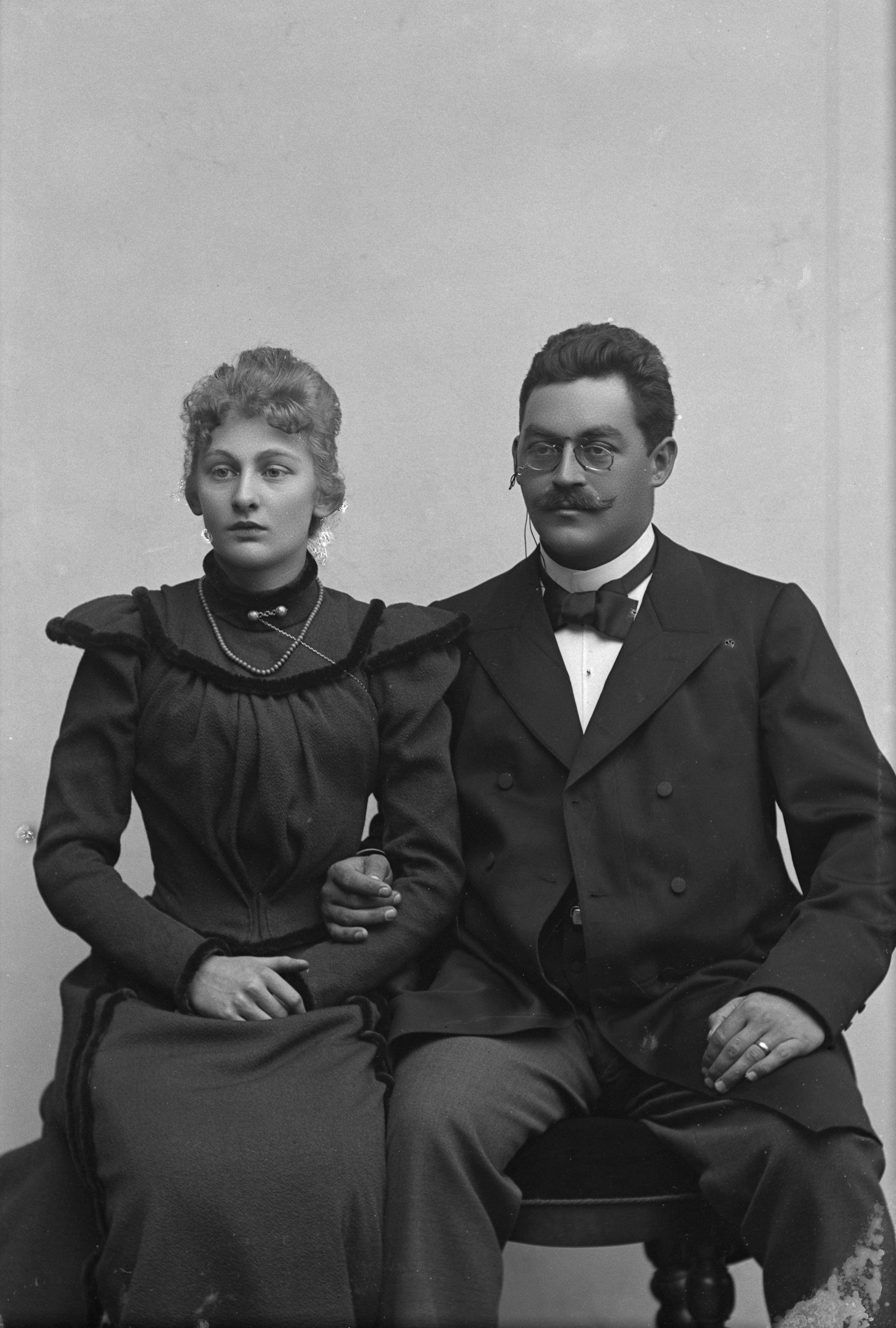 Beskrivning: Porträtt i helfigur av ingenjör H. Thulin med fru.