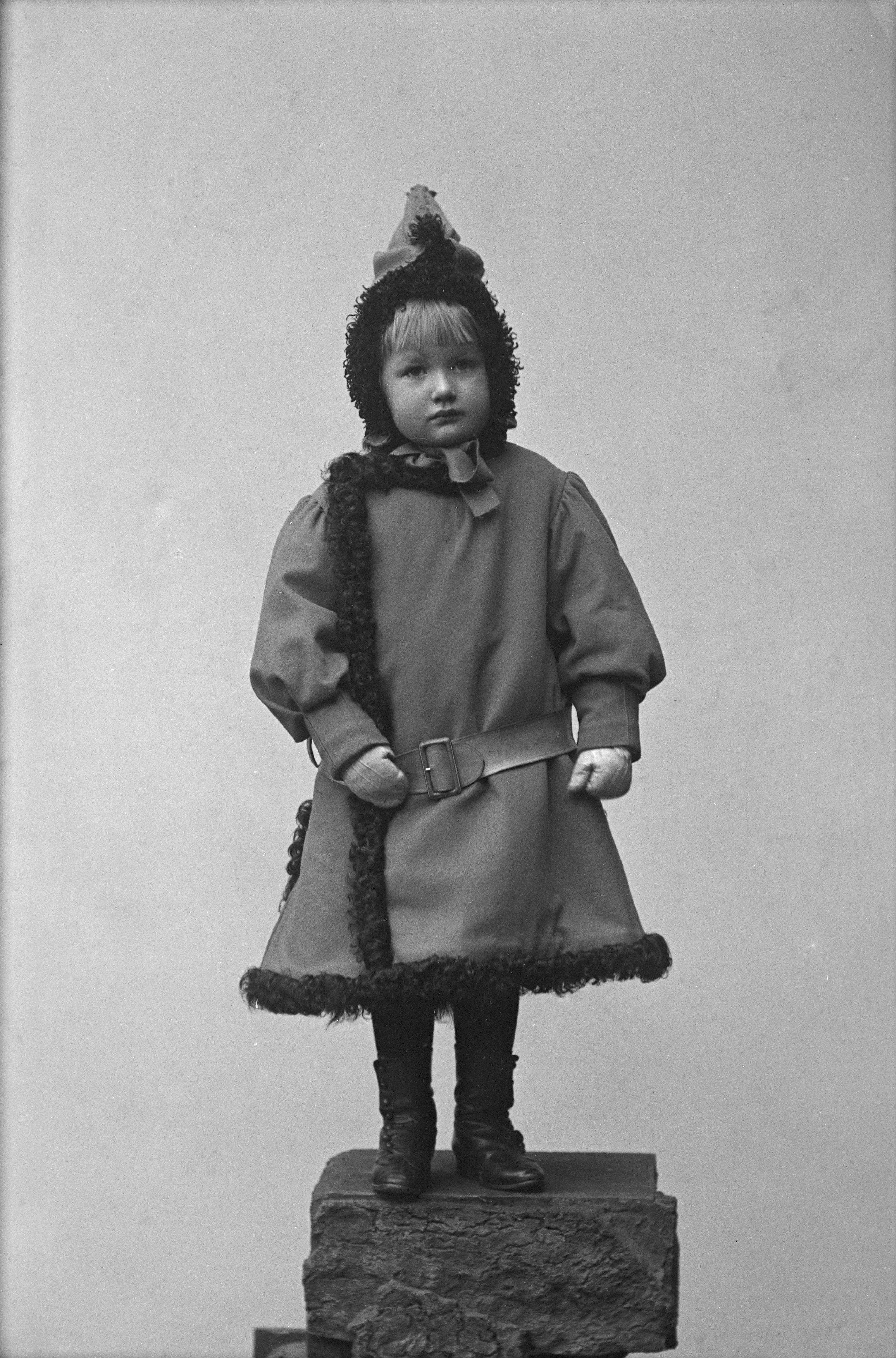 Porträtt i helfigur av Larssons dotter, iklädd ytterkläder, stående på stenmur.
