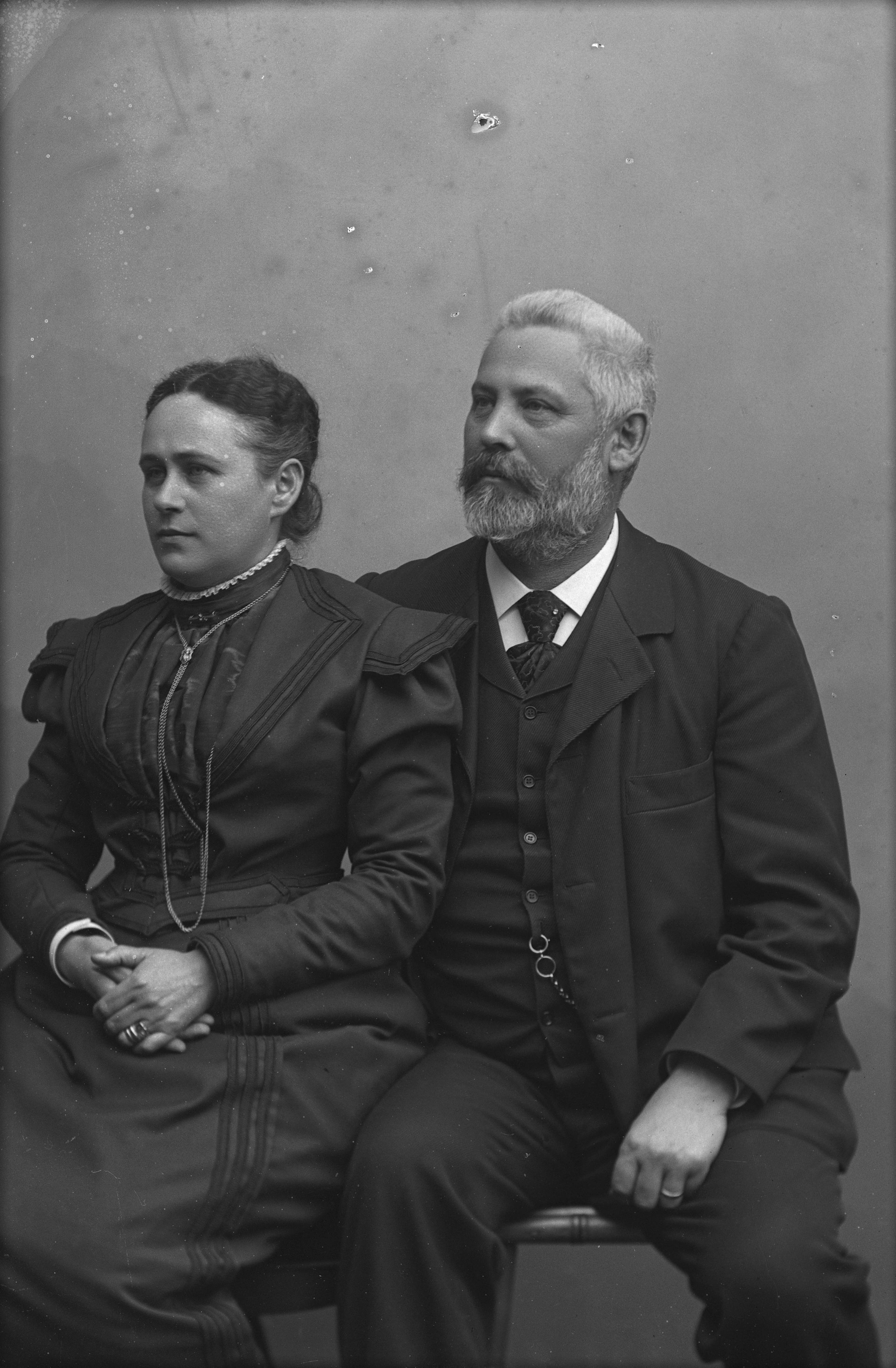 Beskrivning: Porträtt i helfigur av direktör Hall med fru.