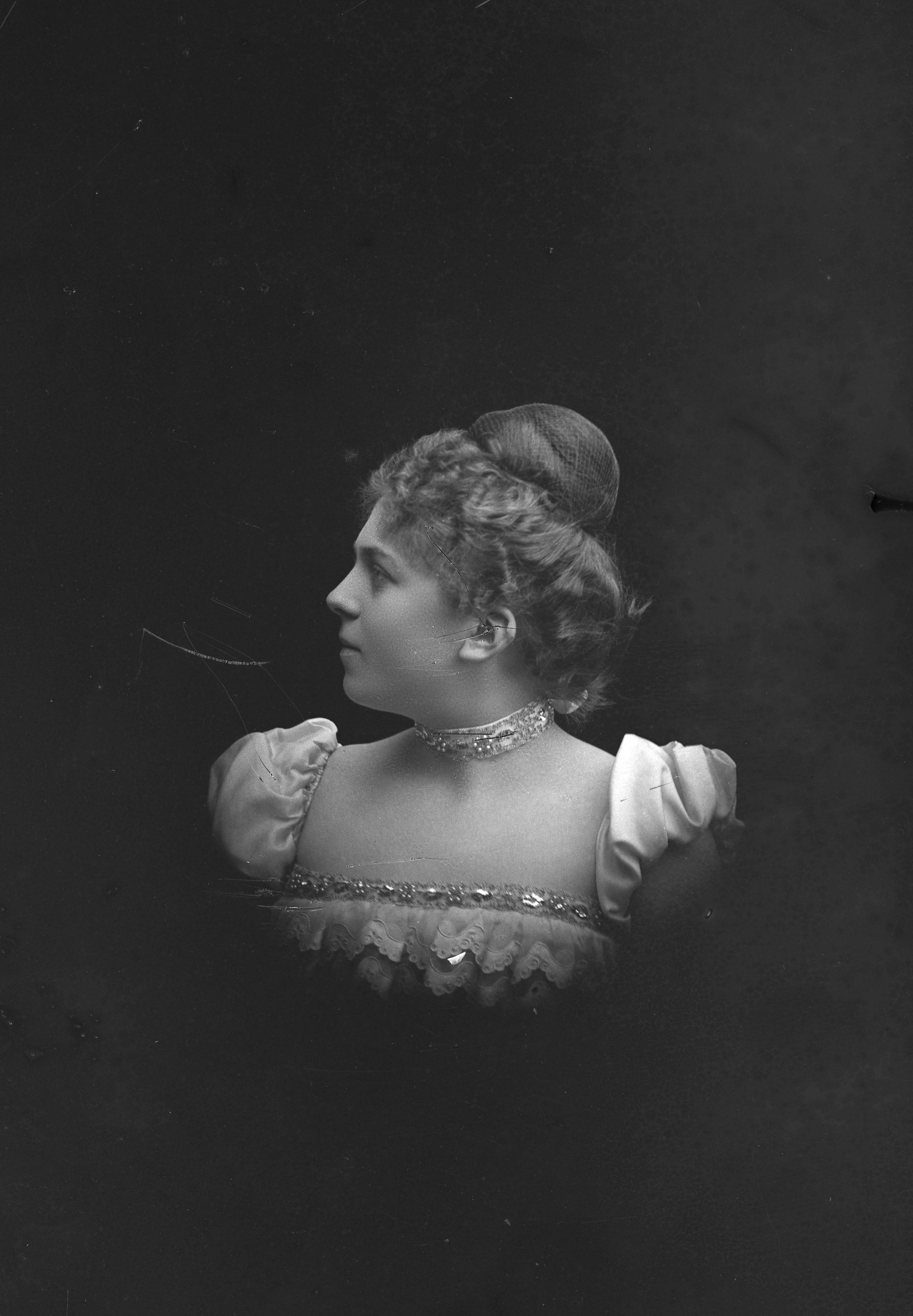 Porträtt i halvfigur av fröken Nelson, ansikte i profil.