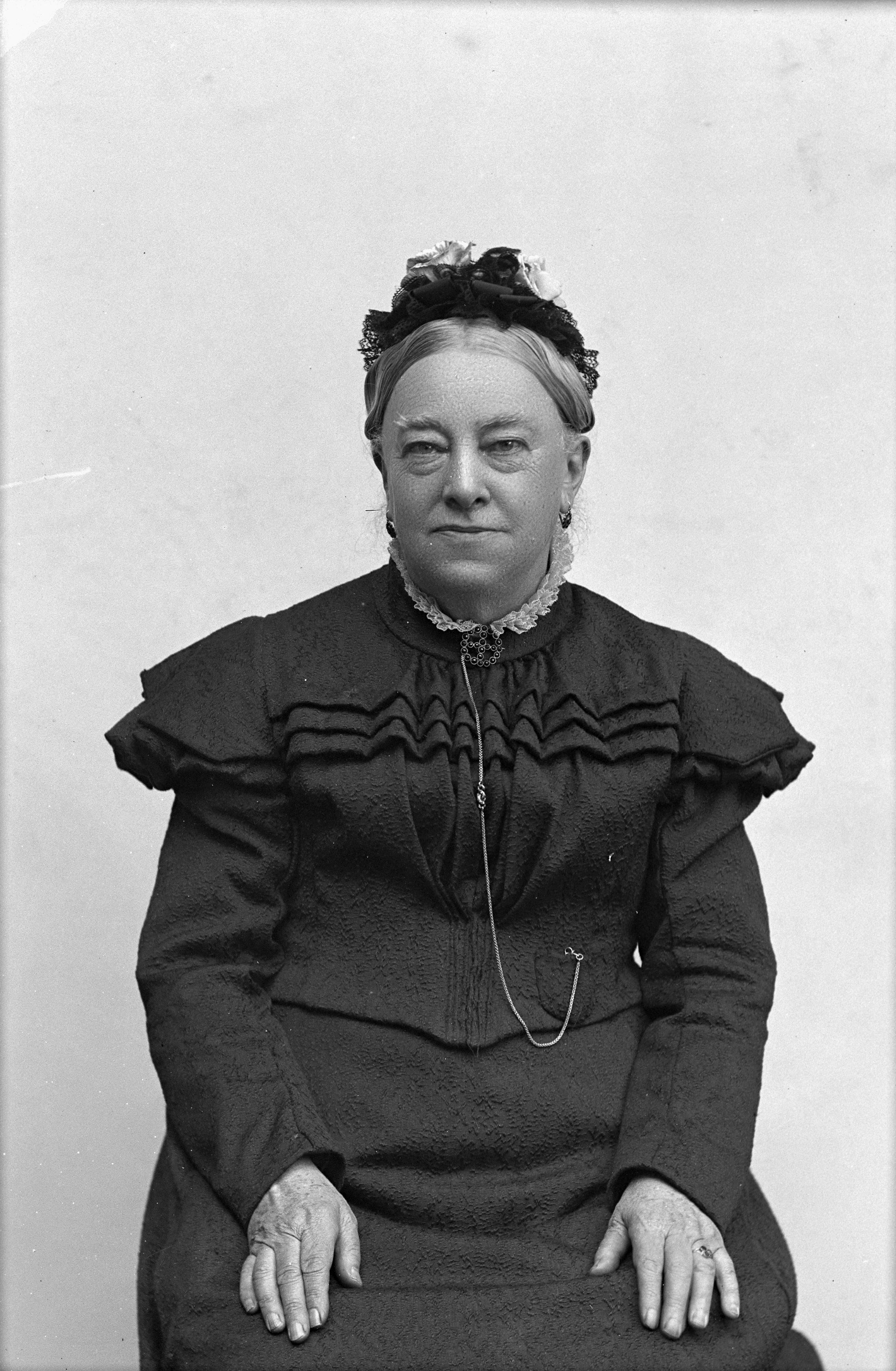 Porträtt i halvfigur av fröken Burchard, iklädd huvudbonad.