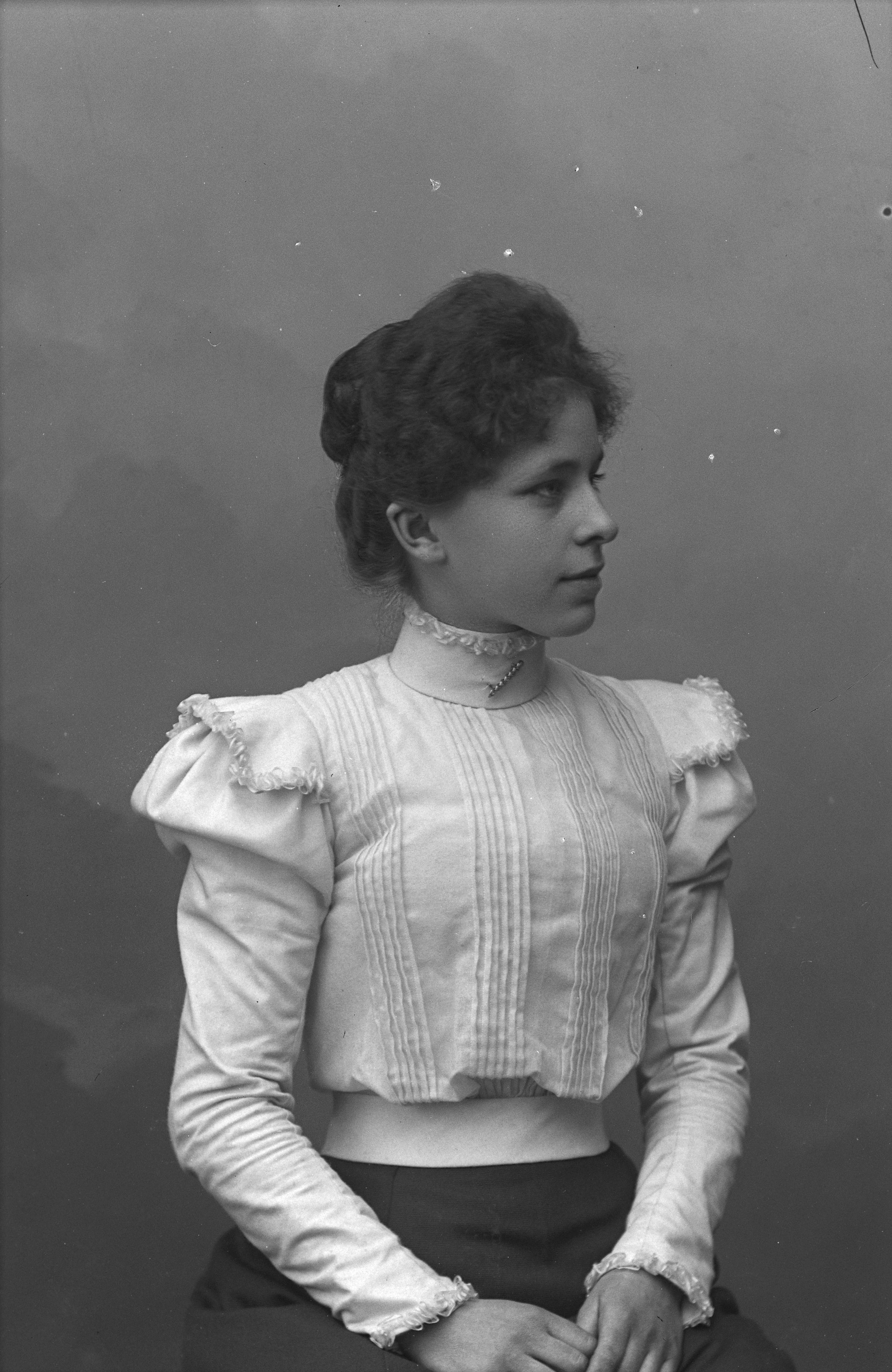 Beskrivning: Porträtt i halvfigur av Sigrid Winberg vid J. G. Hedbergs Bokhandel.