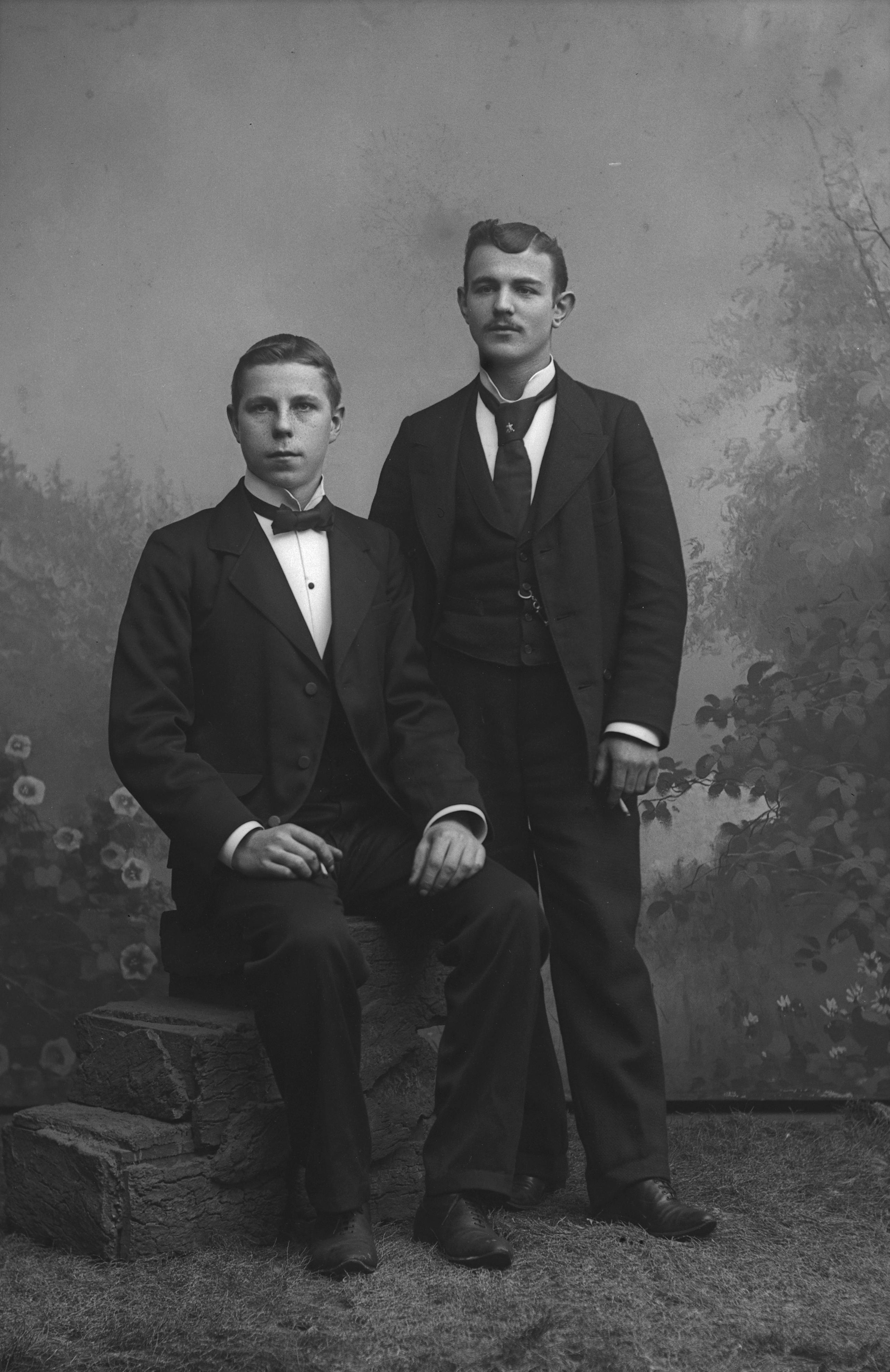 Porträtt i helfigur av O. Severin med okänd man. En av dem sittande på stenmur, den andre stående, hållande cigarett. Fotograferade framför ateljéfond med skogs- och blomstermotiv.