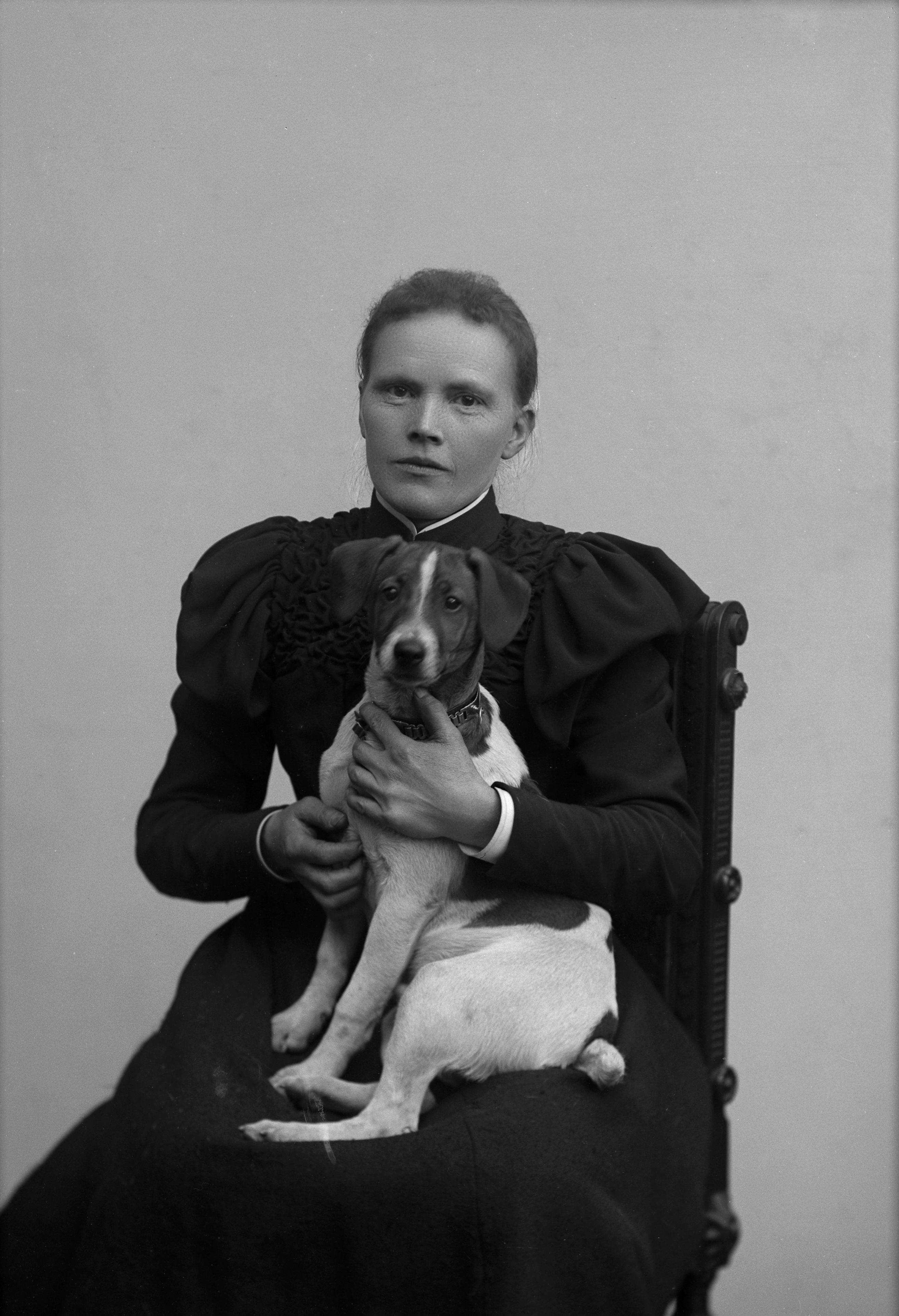 Porträtt i helfigur av Ida Liljegren, sittande, hållande hund.