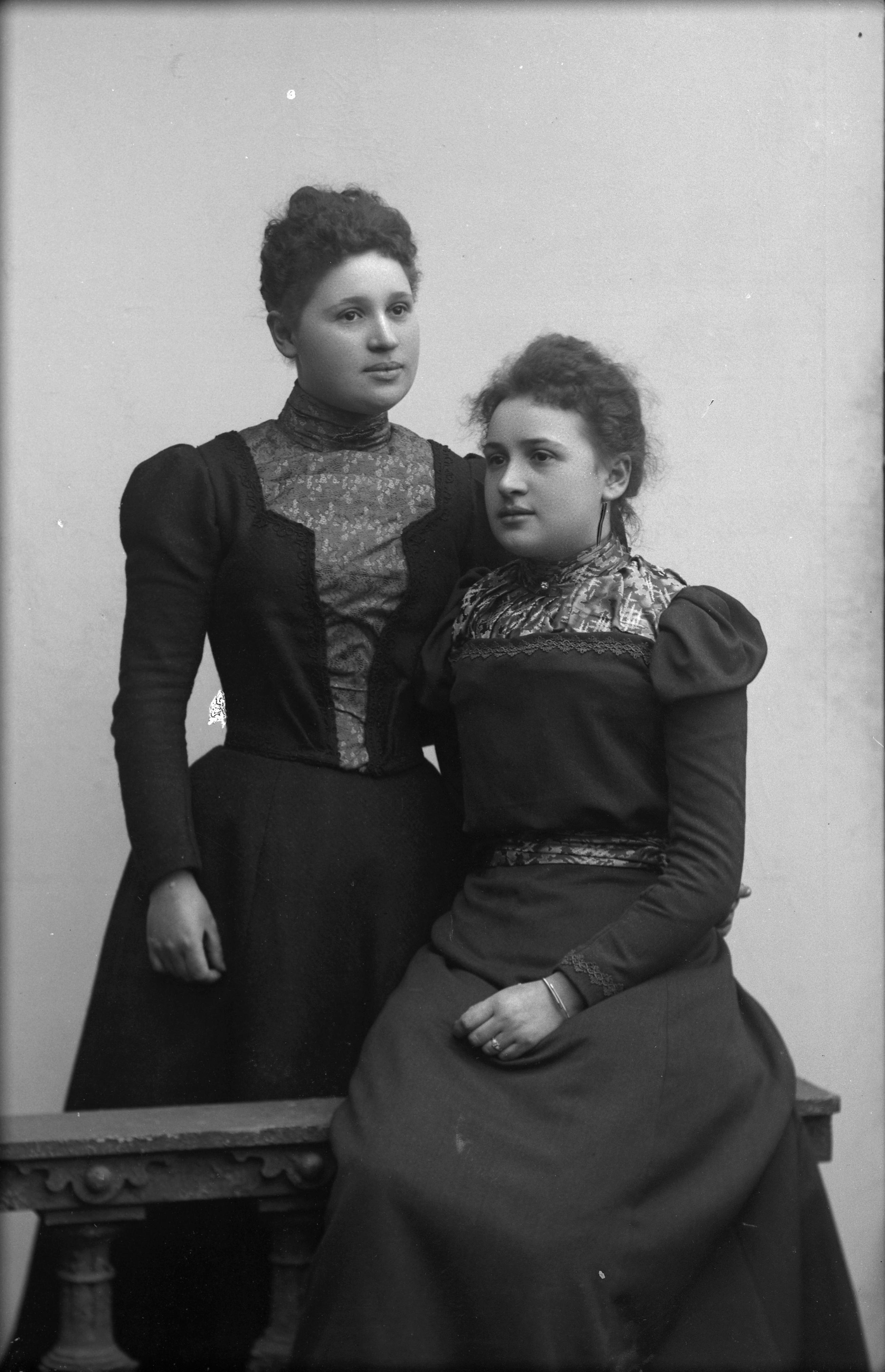 Beskrivning: Porträtt i helfigur av Elisabeth och Anna Norrman. Anna sittande på stenstaket med balustrad.