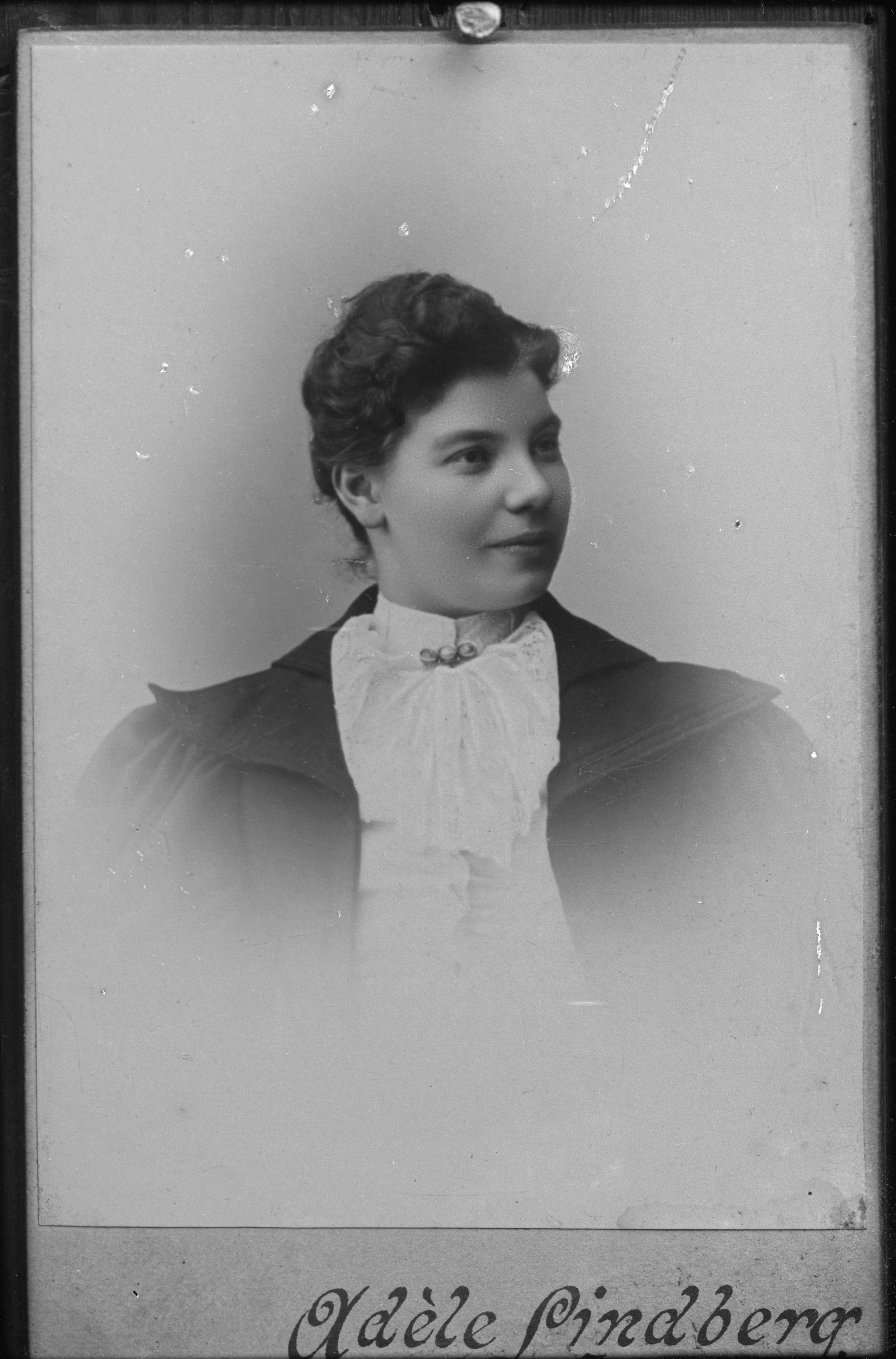 Beskrivning: Porträtt i halvfigur Jenny Grahn. Visitkort med otydlig ateljélogotyp: "Adele Sindberg" (?)