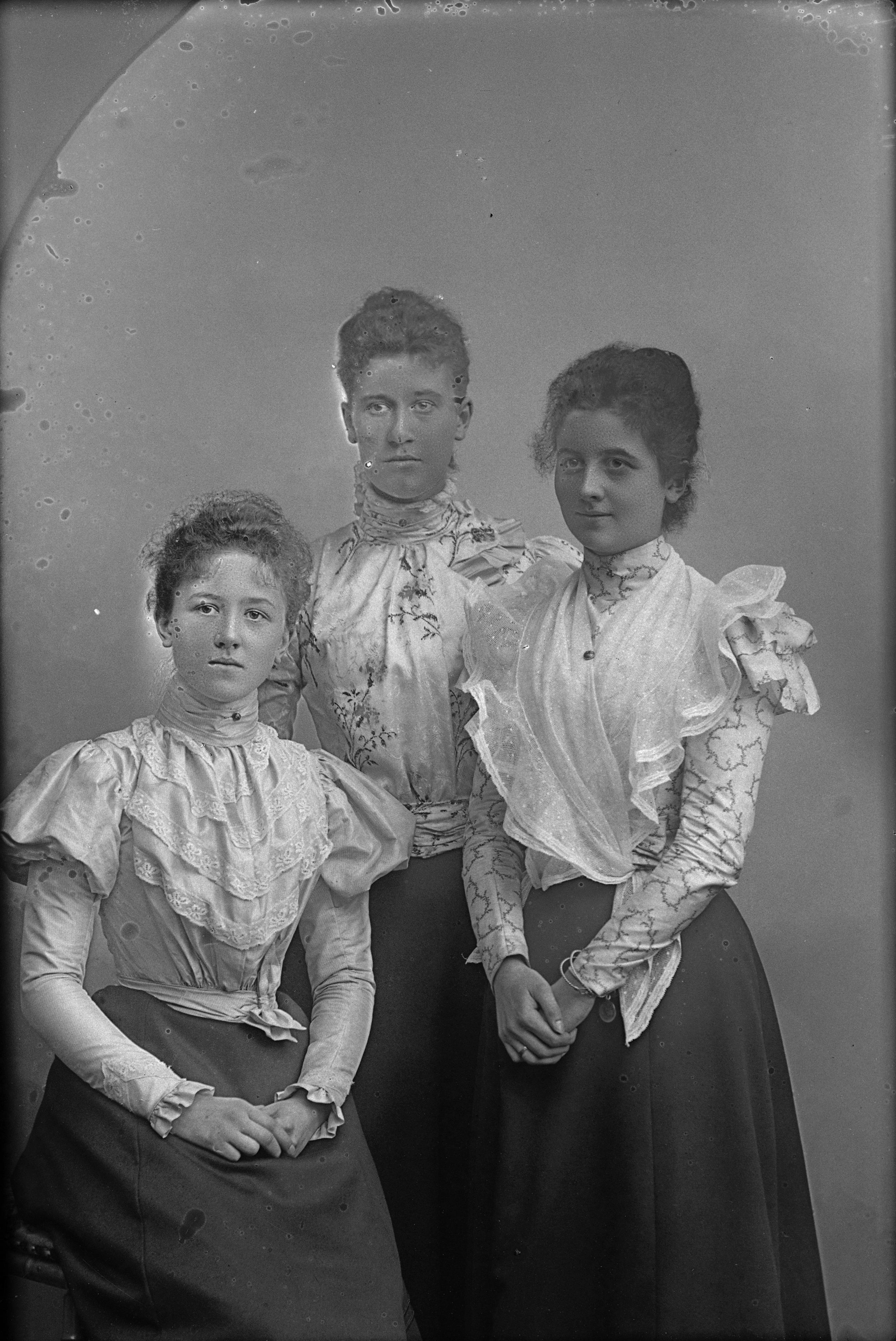Porträtt i helfigur av fröken von Mentzen med okänt sällskap, två andra kvinnor.