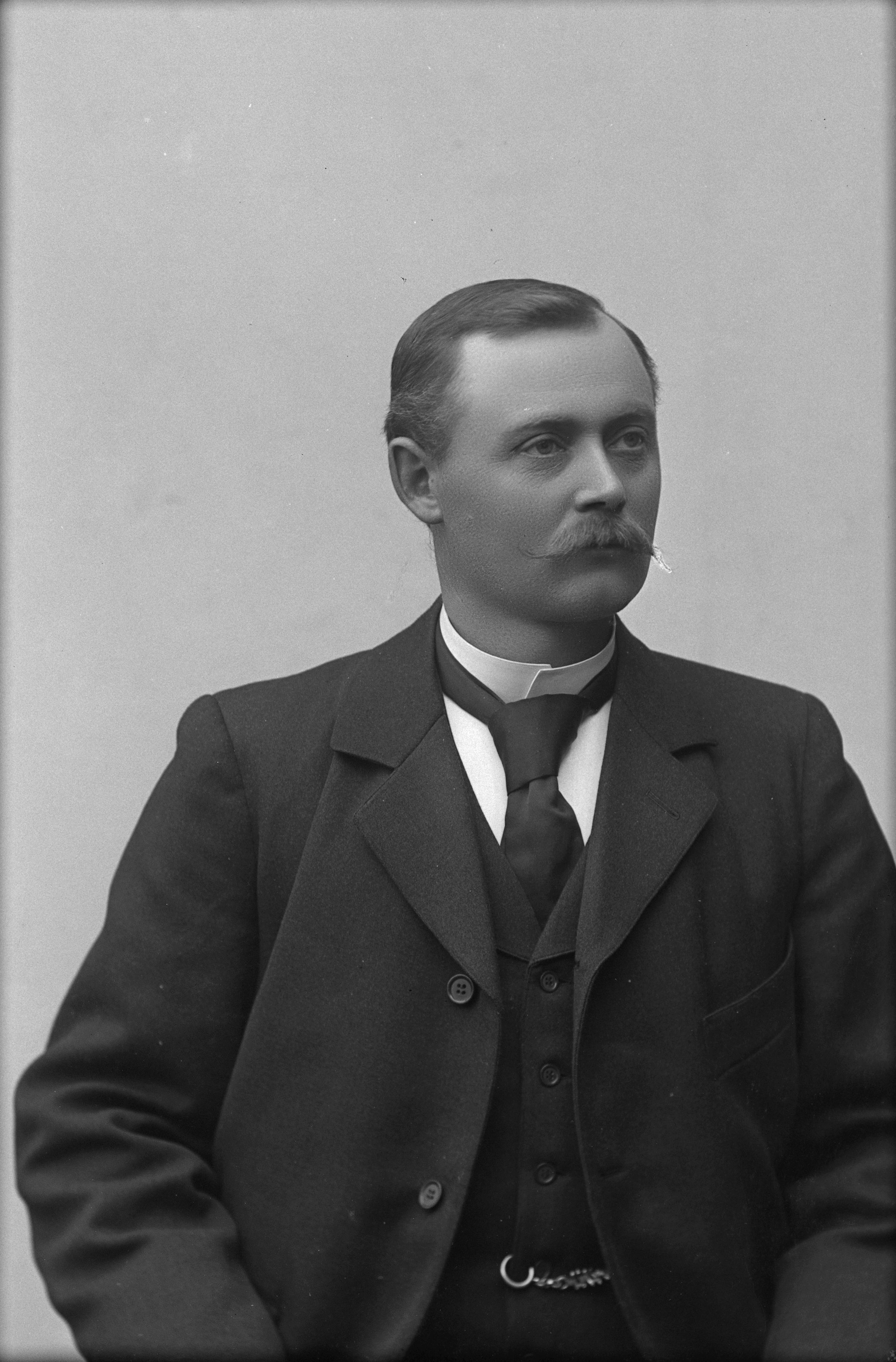 Beskrivning: Porträtt i halvfigur av bokhållare M. Olsson.