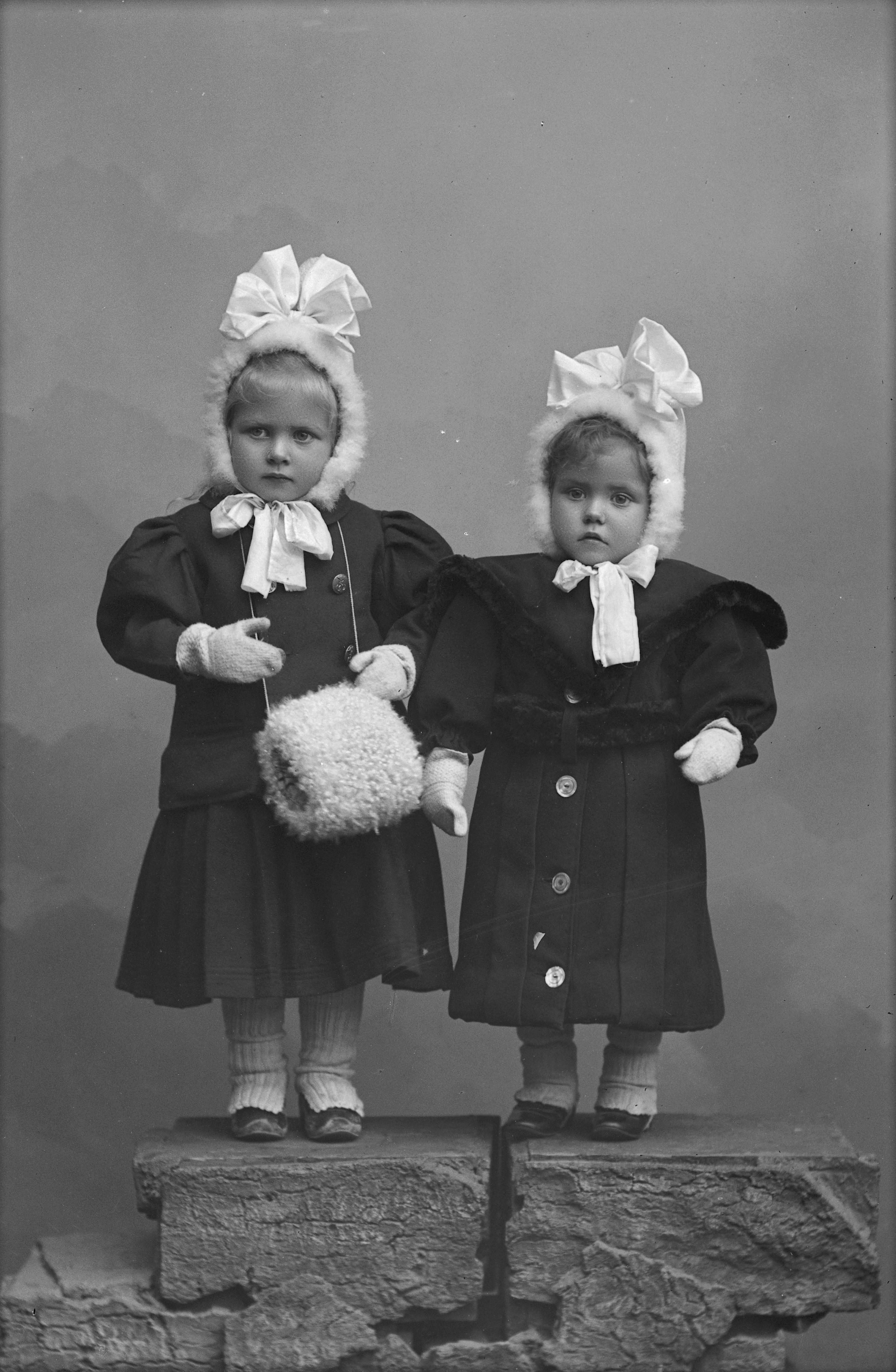 Porträtt i helfigur av fru Pohls döttrar, iklädda ytterkappor, vantar och mössa med rosett, stående på tegelmur. Den äldsta dottern hållande handmuff.