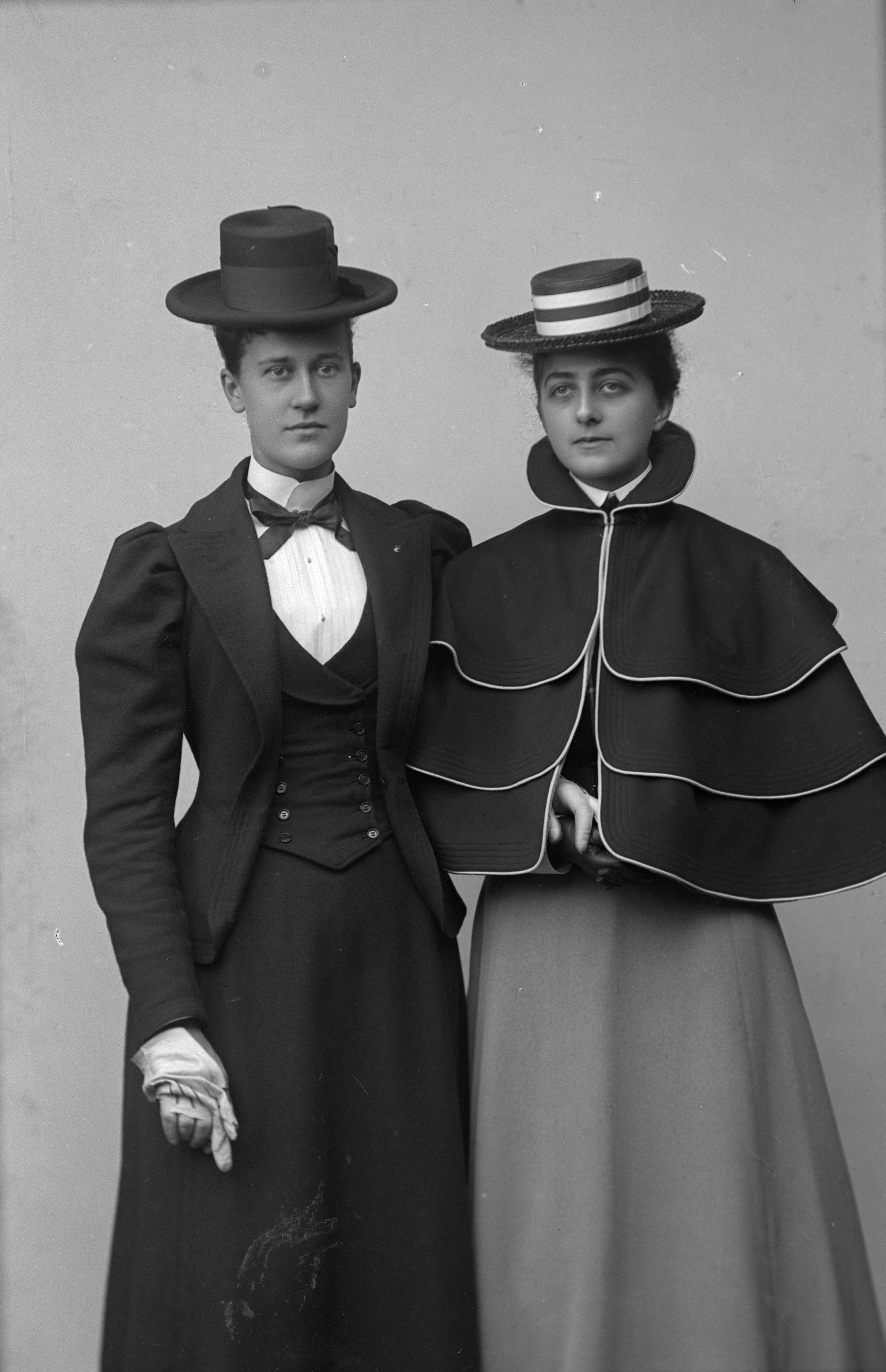 Porträtt helfigur av fröken Harmens med okänd kvinna, båda iklädda hattar. En av kvinnorna i kappa, den andra i cape.