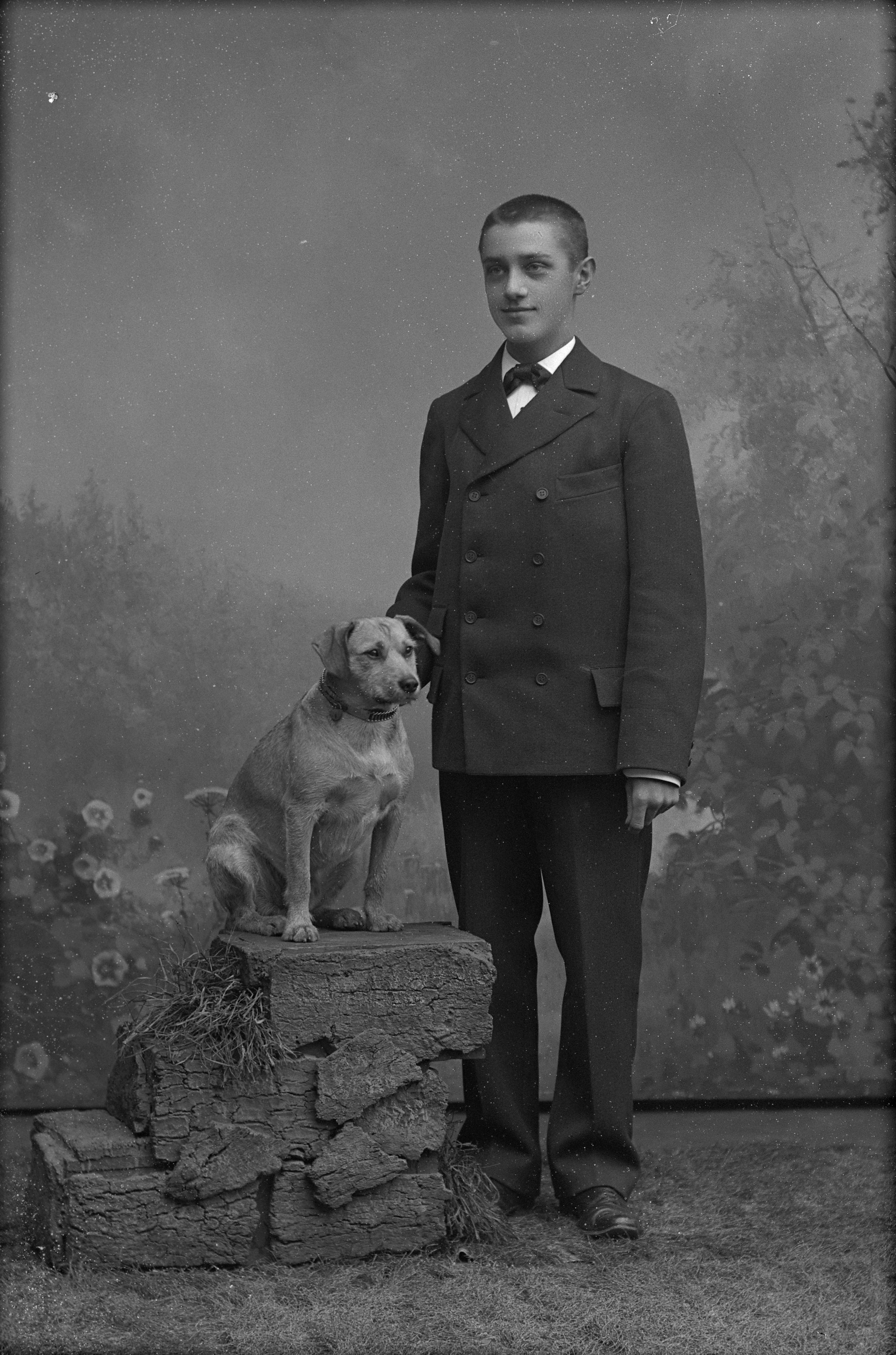 Porträtt i helfigur av herr Nilsson, såtende vid stenhäll. Hund sittande på stenhällen. Ateljéfond med skogs- och blomstermotiv utgör bakgrunden.