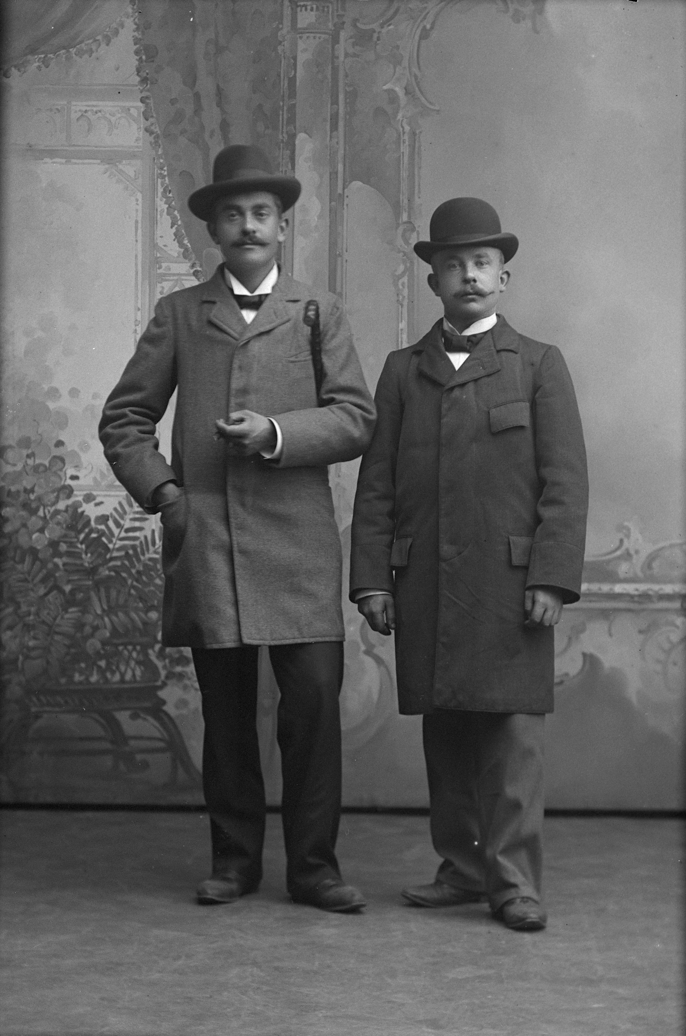 Porträtt helfigur av herr Anderberg och herr Lindström, iklädda pommonstop och ytterrockar. En av männen hållande cigarr.