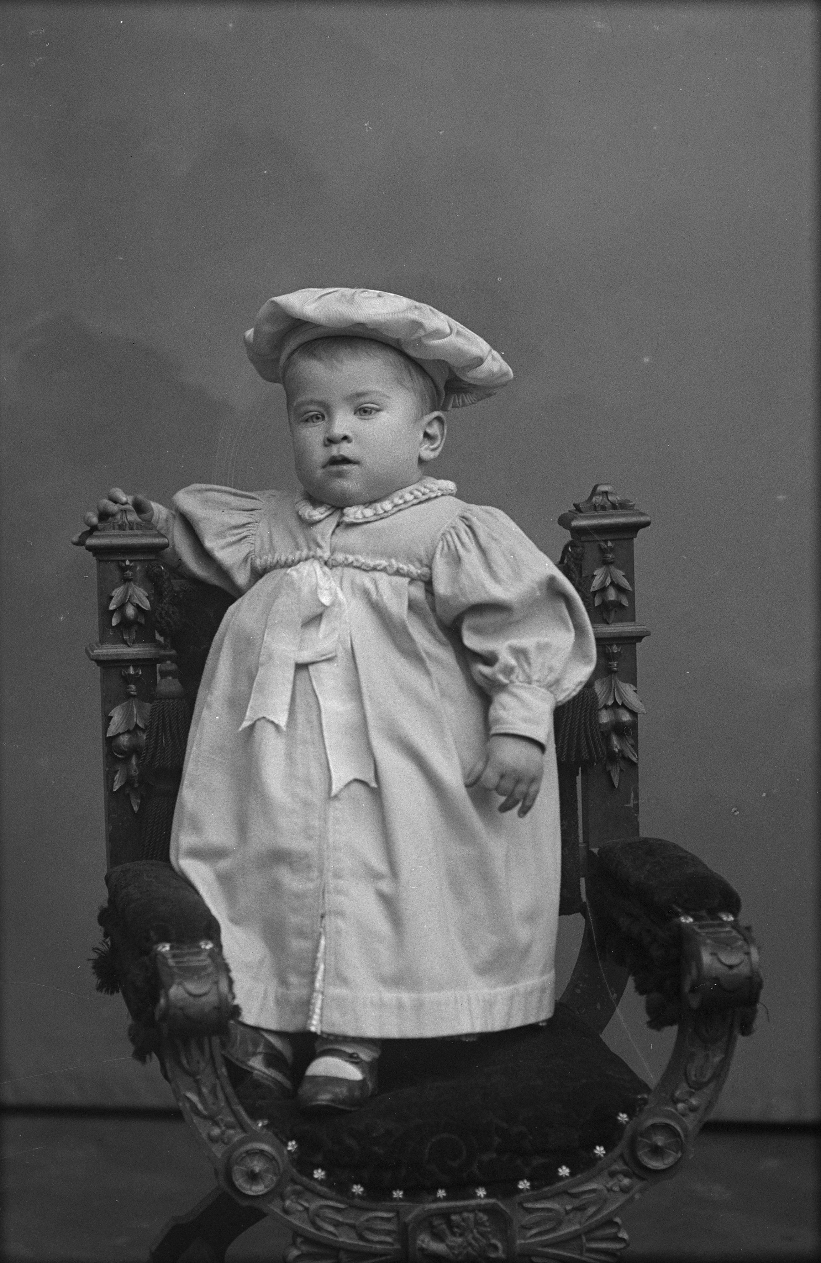 Porträtt i helfigur av Bengt Rosenius, iklädd mössa, stående på munkstol. Fotograferad på sin ettårsdag.