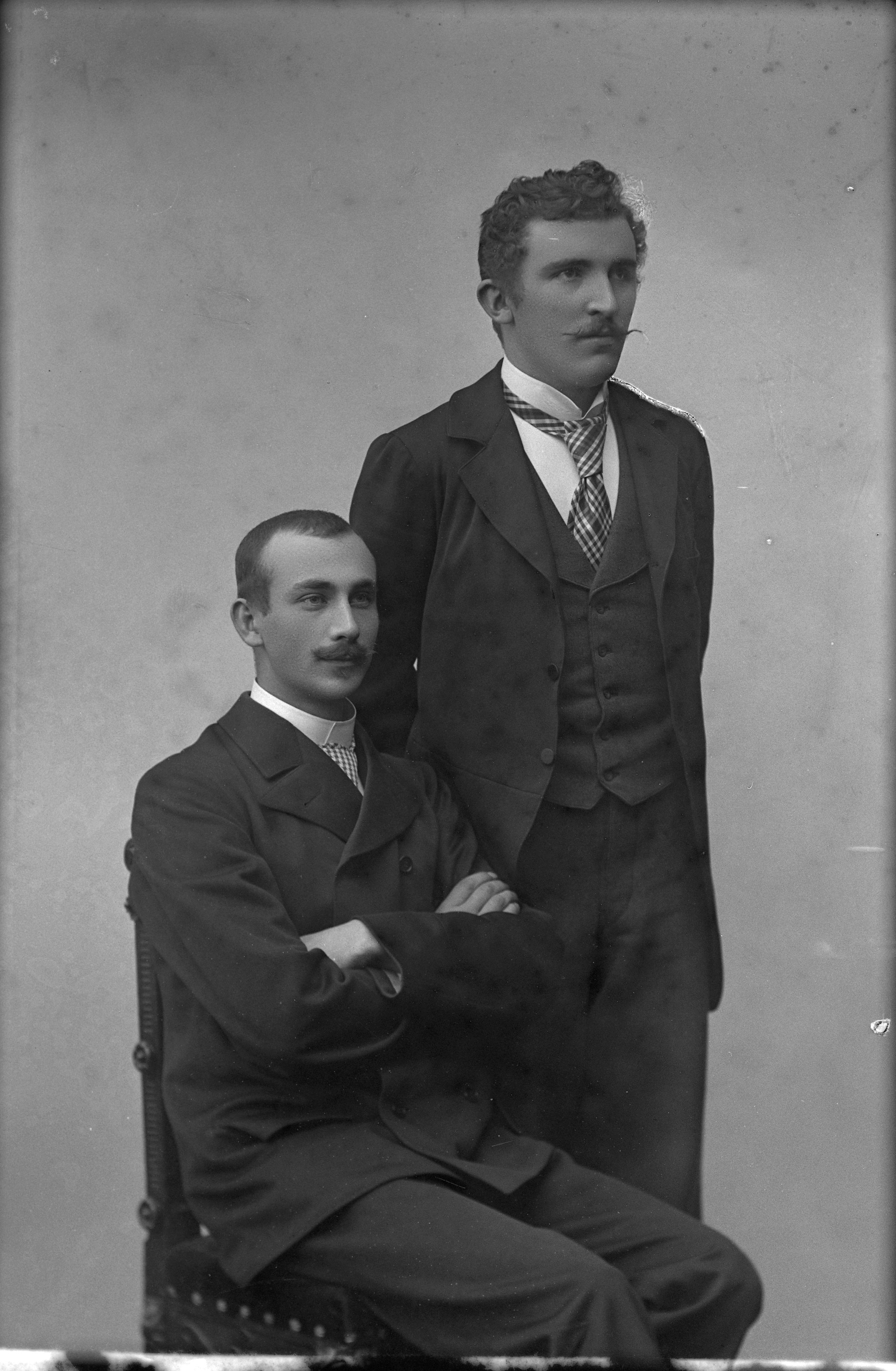 Beskrivning: Porträtt i helfigur av herr Ekelund med okänd man. En av männen sittande.