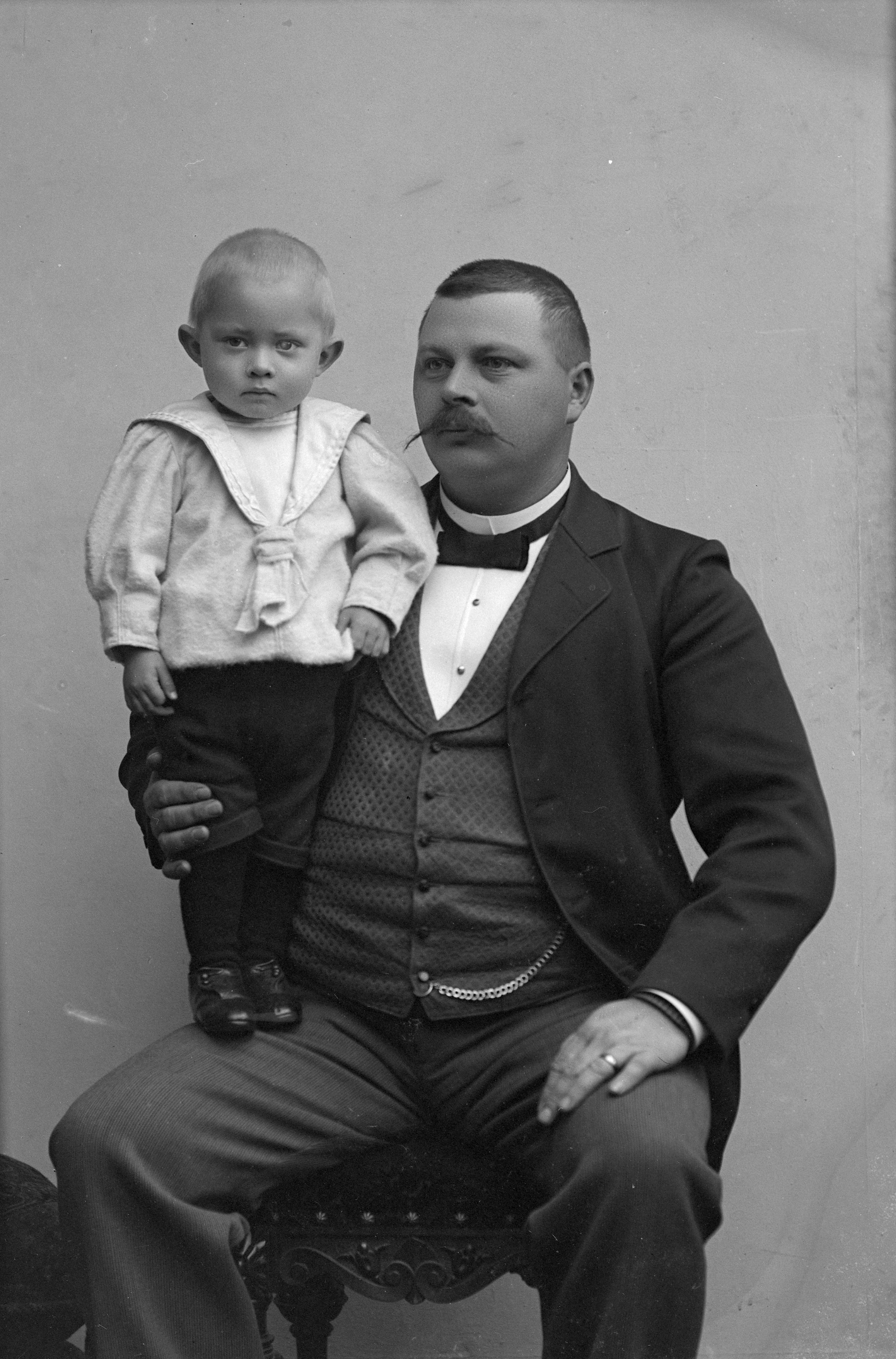 Porträtt i helfigur av lantbrukare J. Nilsson med son. Fadern sittande med sonen ståående på knät. Sonen iklädd sjömanskostym.