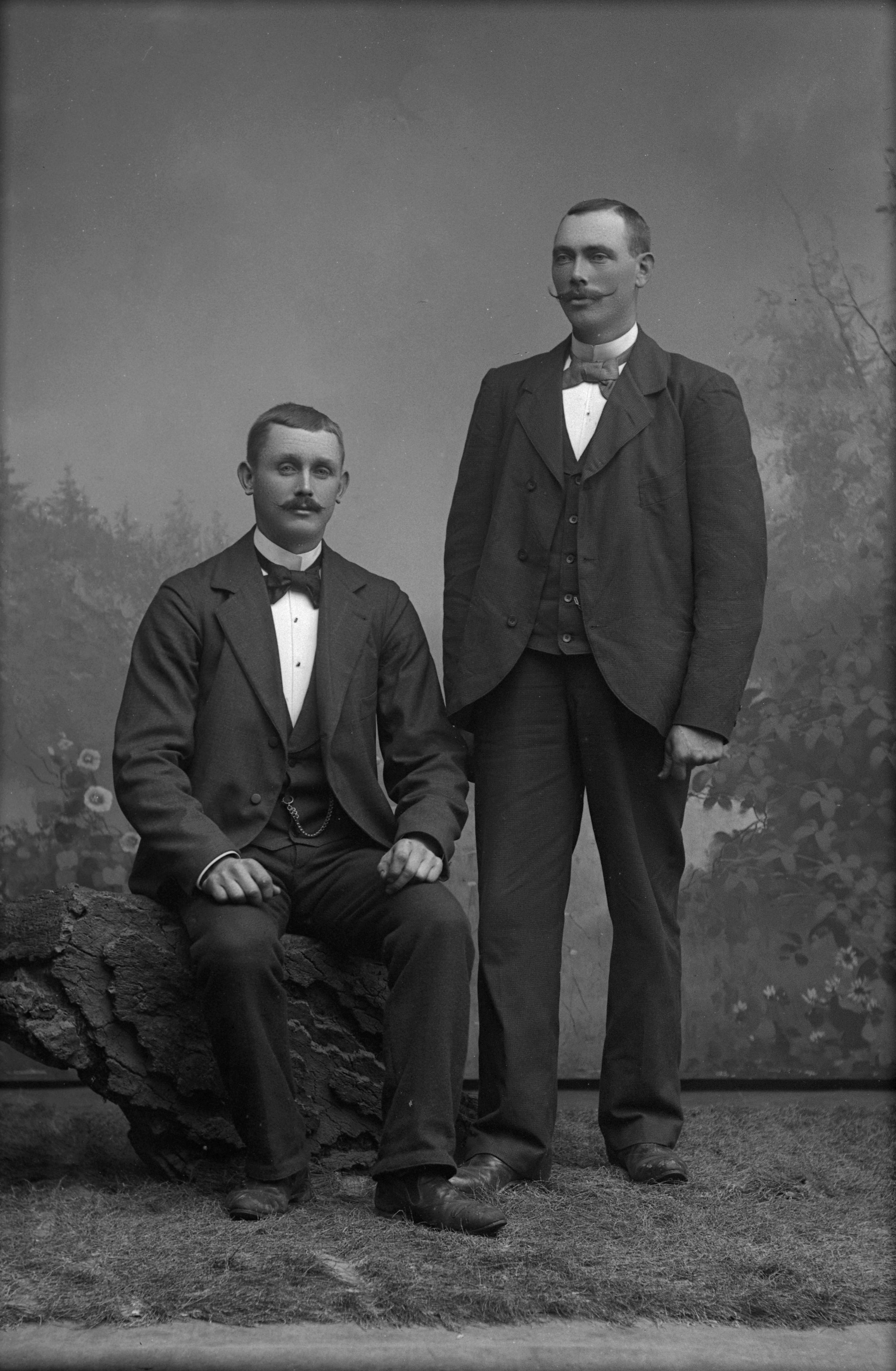 Porträtt i helfigur av Nils Larsson med okänd man. En av männen sittande på stenhäll. Ateljéfond med skogs- och blomstermotiv utgör bakgrunden.