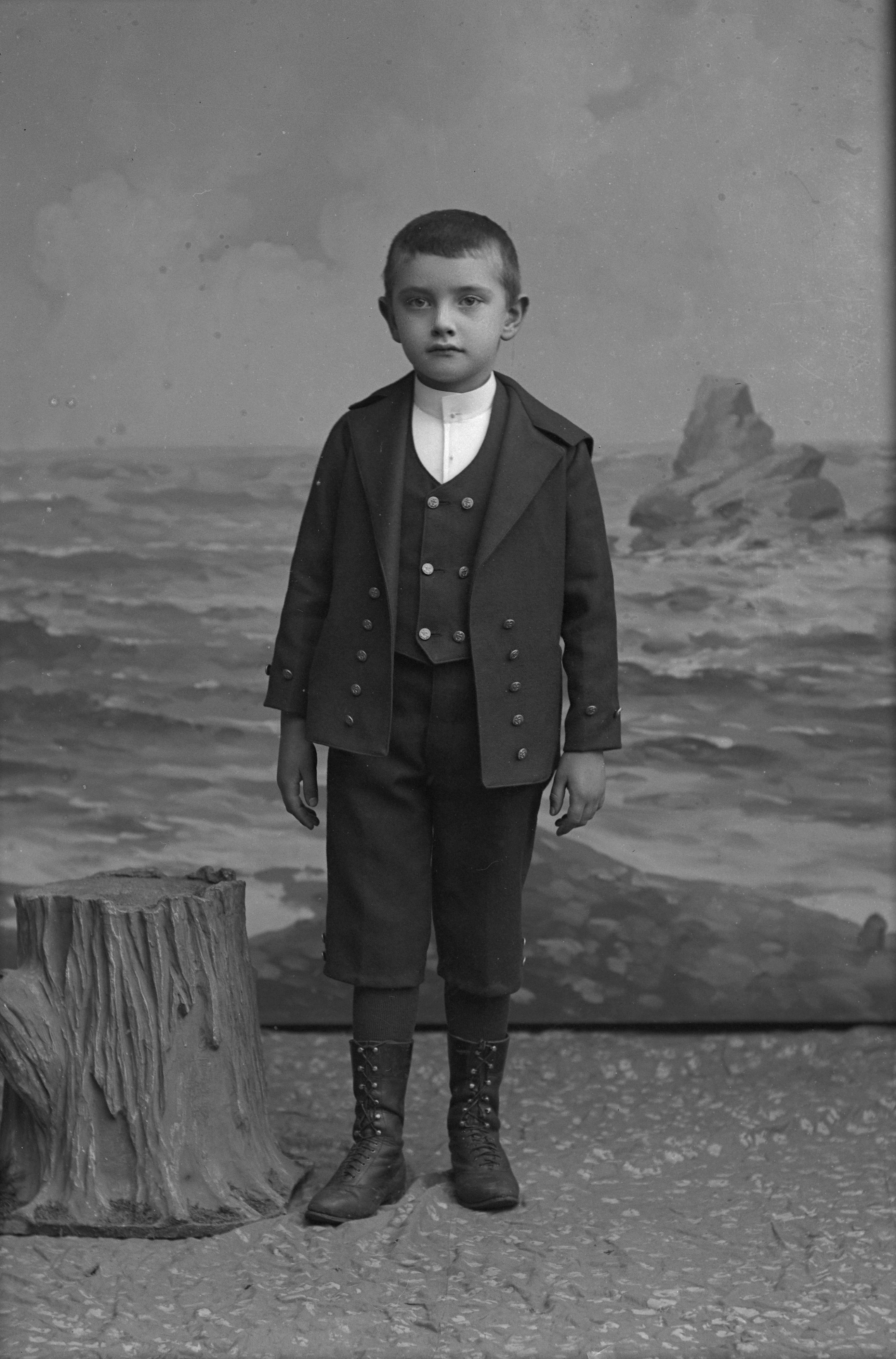 Porträtt i helfigur av Nils Otto Einar Nilsson stående vid stubbe. Fotograferad framför ateljéfond med havsmotiv.