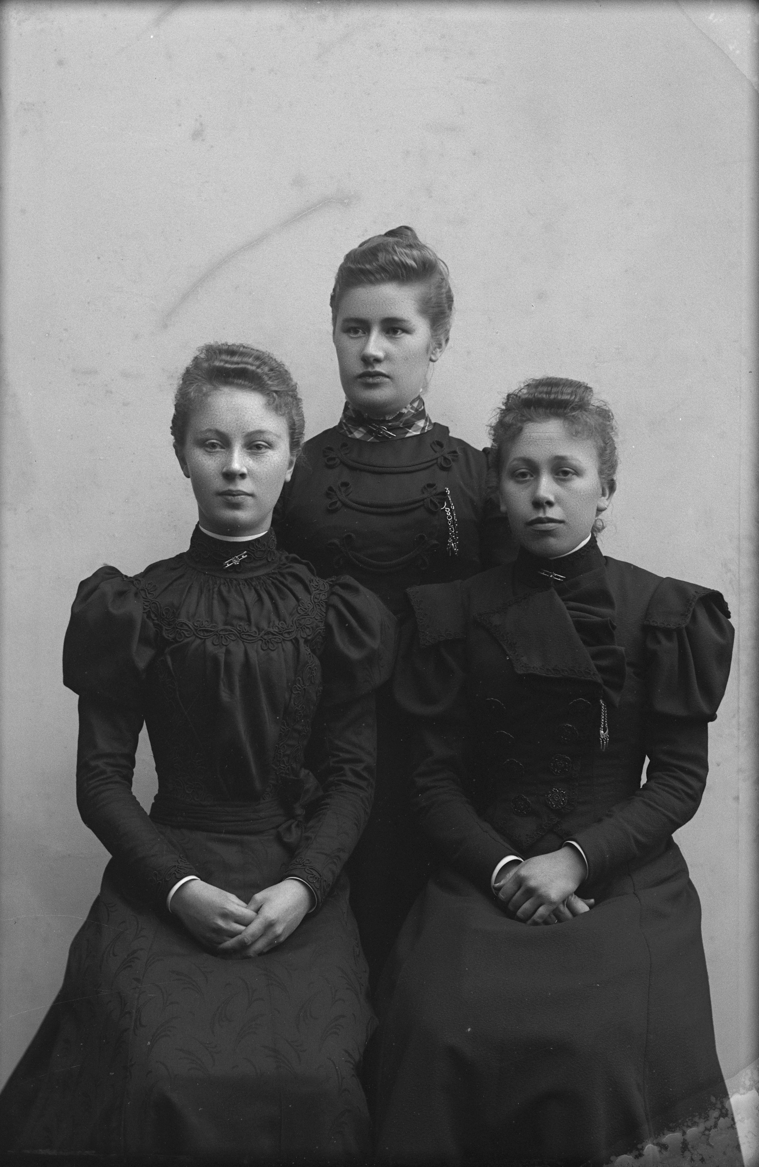 Porträtt i helfigur av Hedvig Andersson, Sigrid Lenander och Anna Nordström. Anna Nordström stående i mitten.