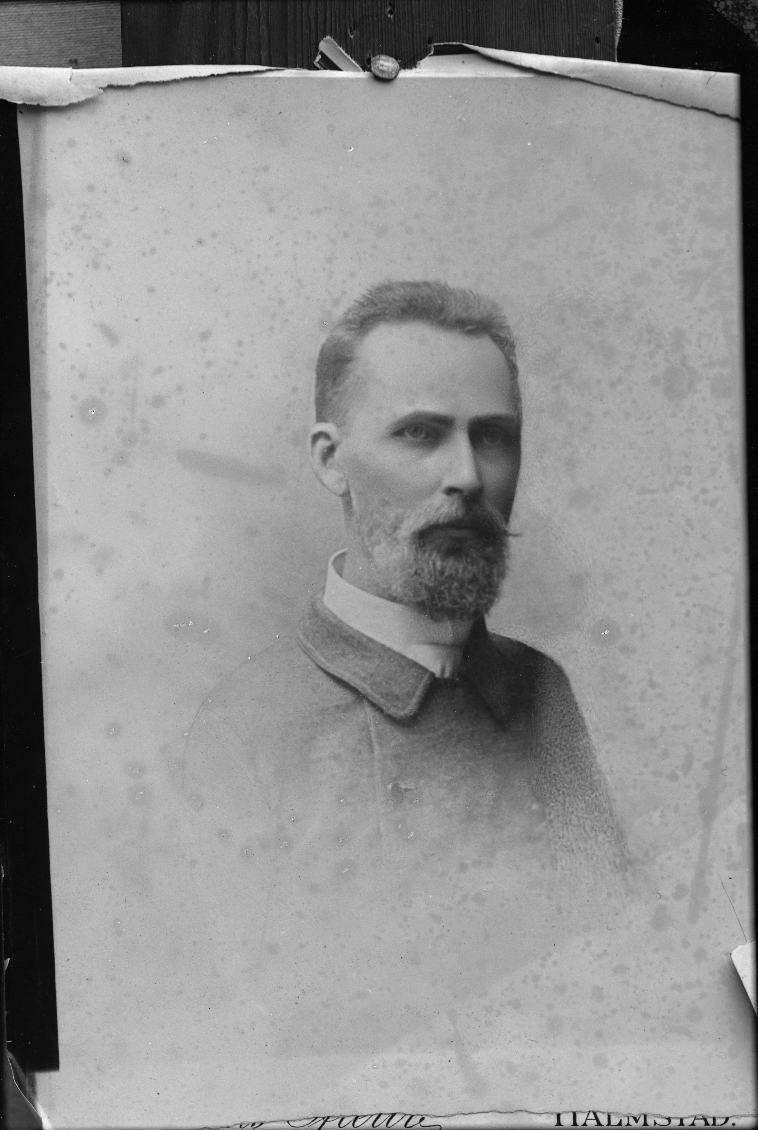 Beskrivning: Porträtt i halvfigur av oidentifierad man. Visitkort med oläslig ateljélogotyp.