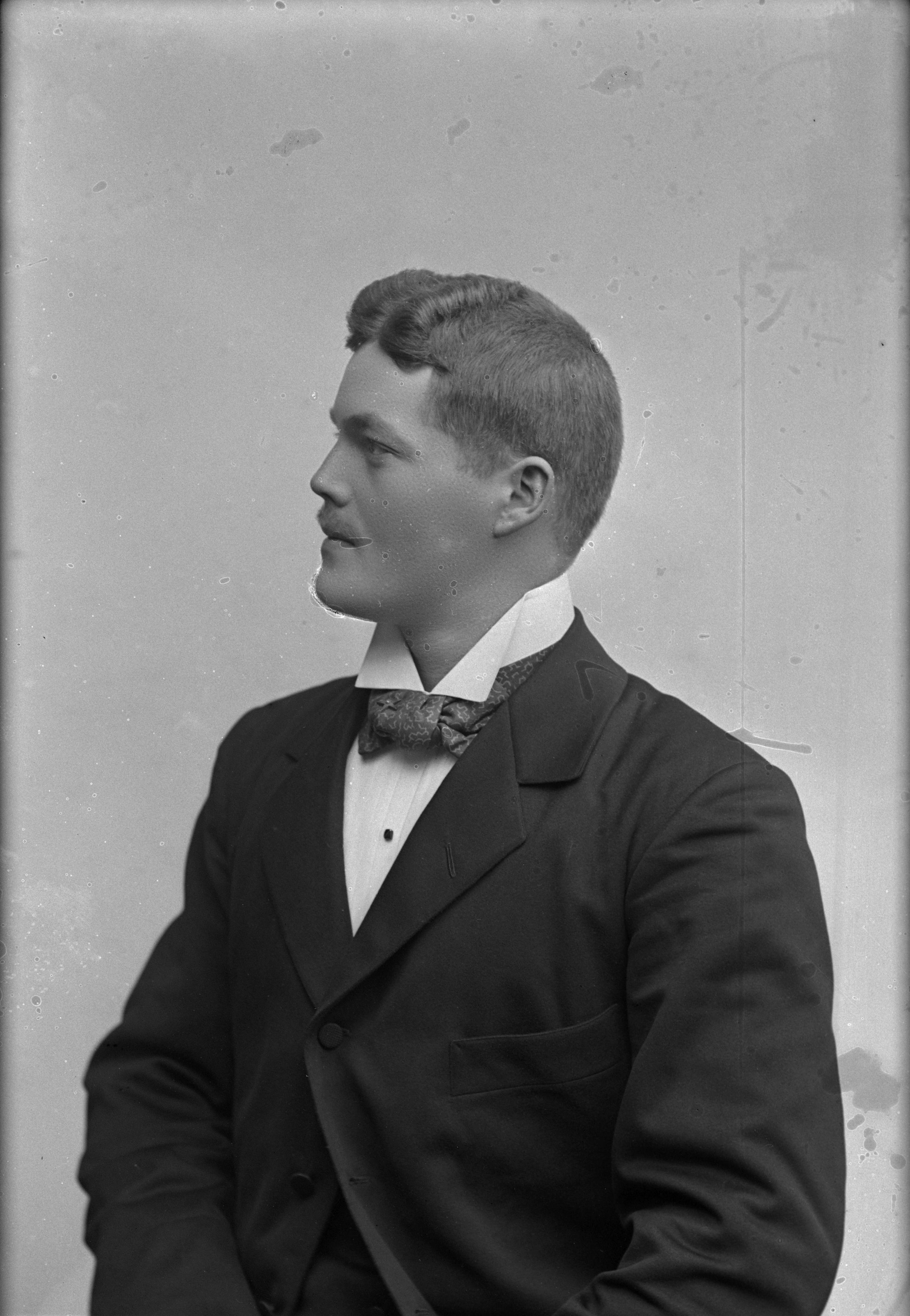 Porträtt i halvfigur av L. Larsson, ansikte i profil.