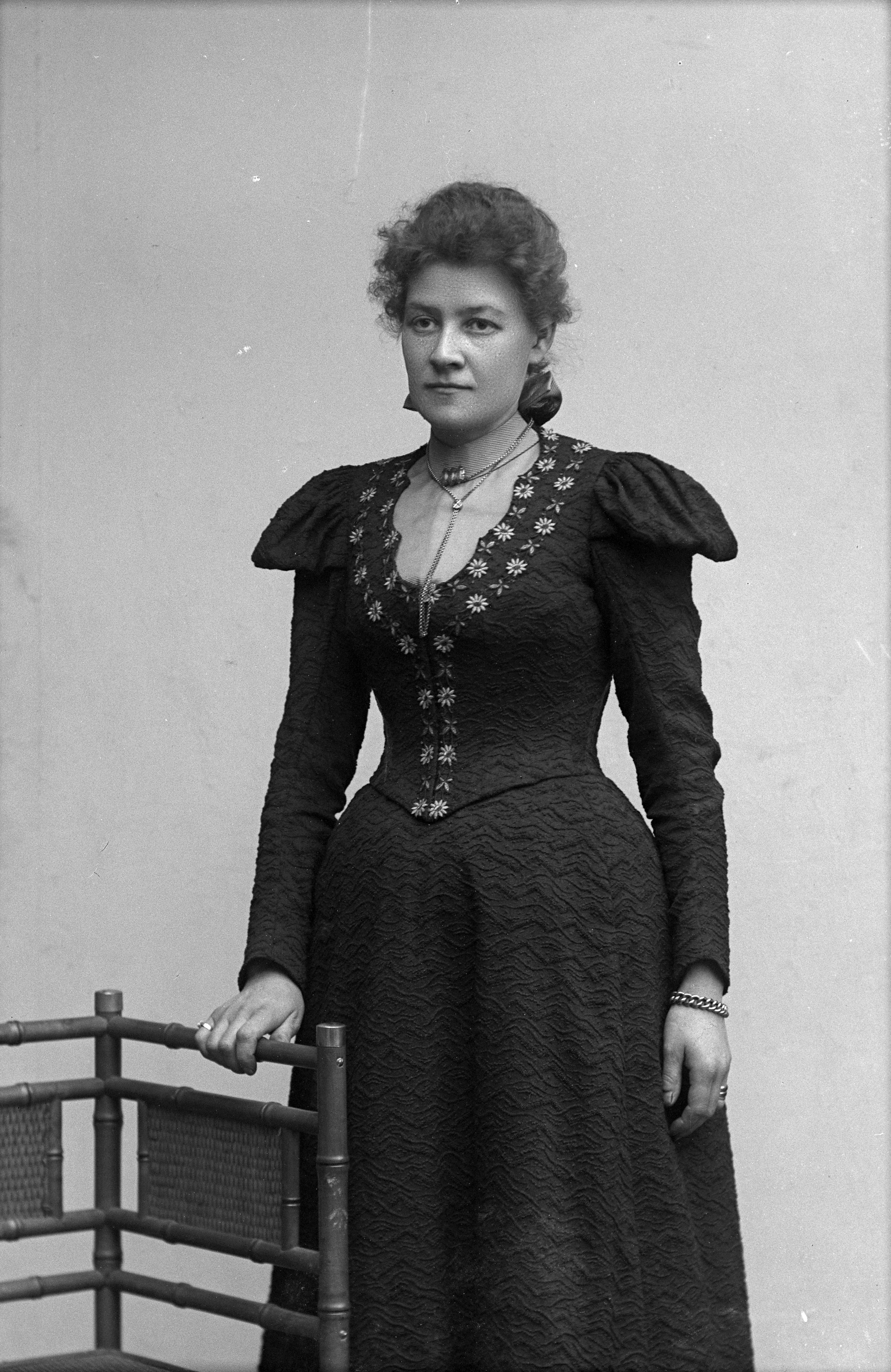 Porträtt i helfigur av fru Palmkvist, stående vid stol.