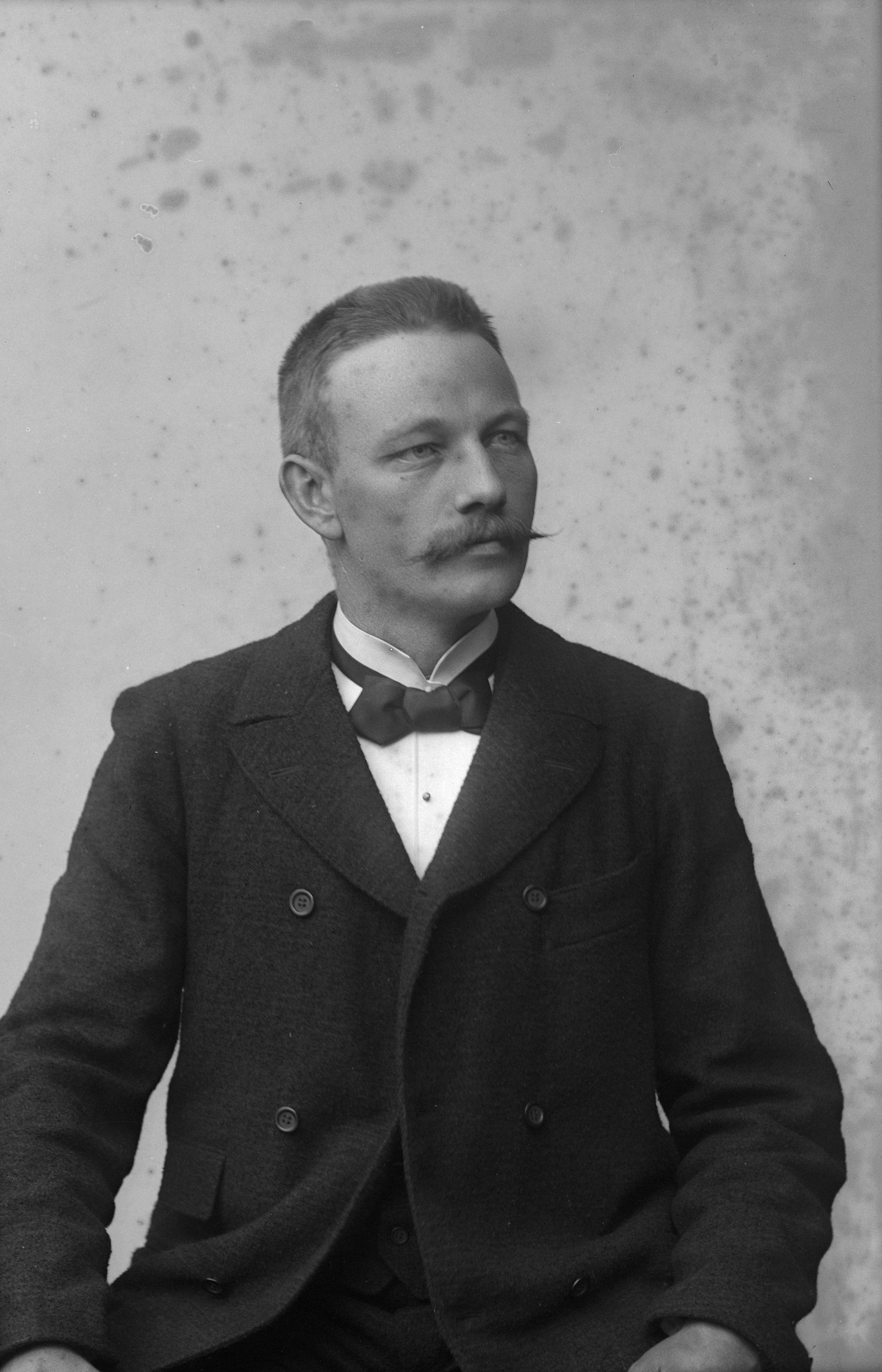 Beskrivning: Porträtt i halvfigur av N. Jönsson vid Gunnarps Tegelbruk.