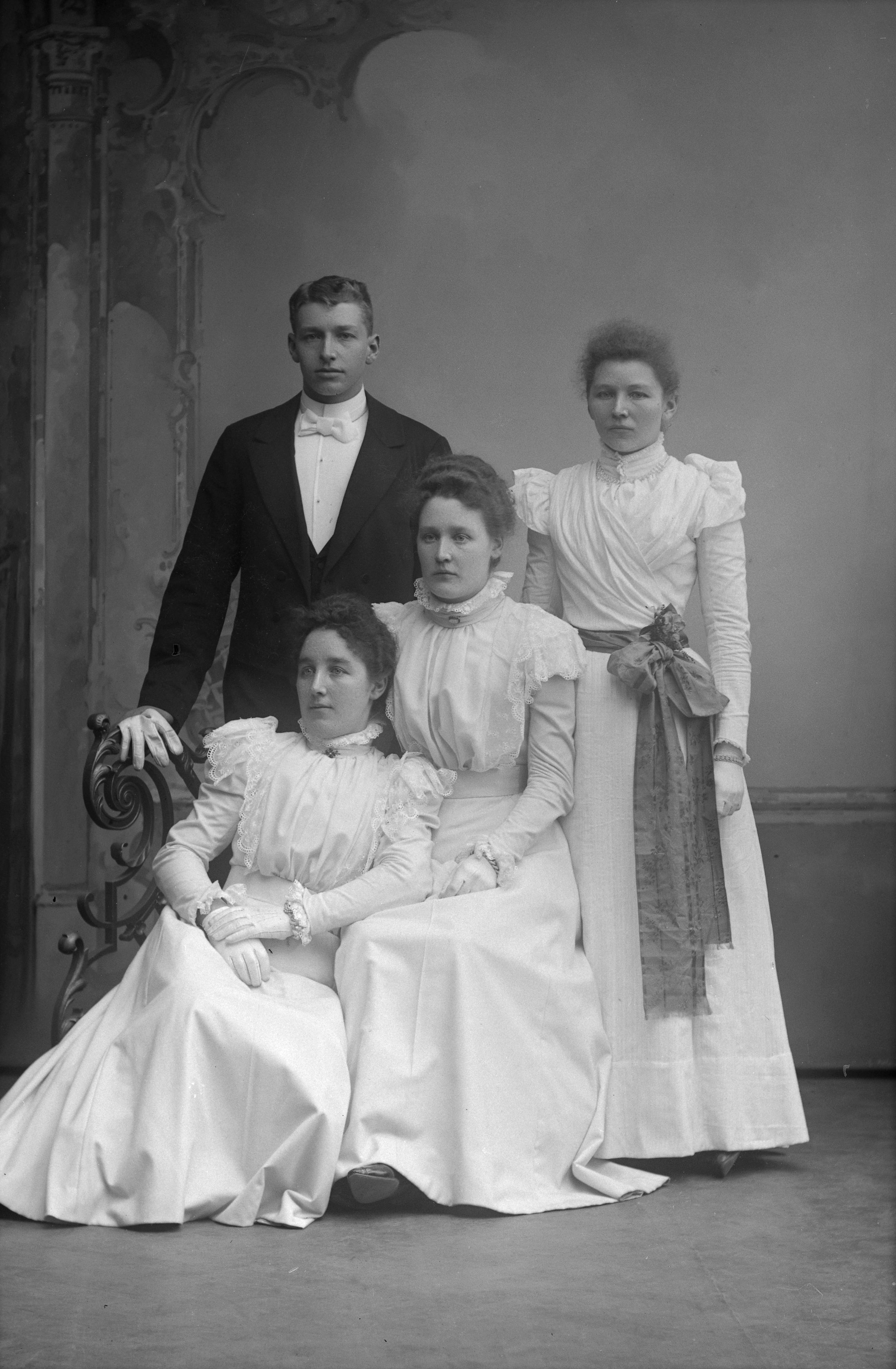 Porträtt i helfigur av Carl Olsson tillsammans med ett okänt kvinnosällskap, sannolikt systrar. Kvinnan stående t.h. har ett brett band runt midjan, knutet i rosett.