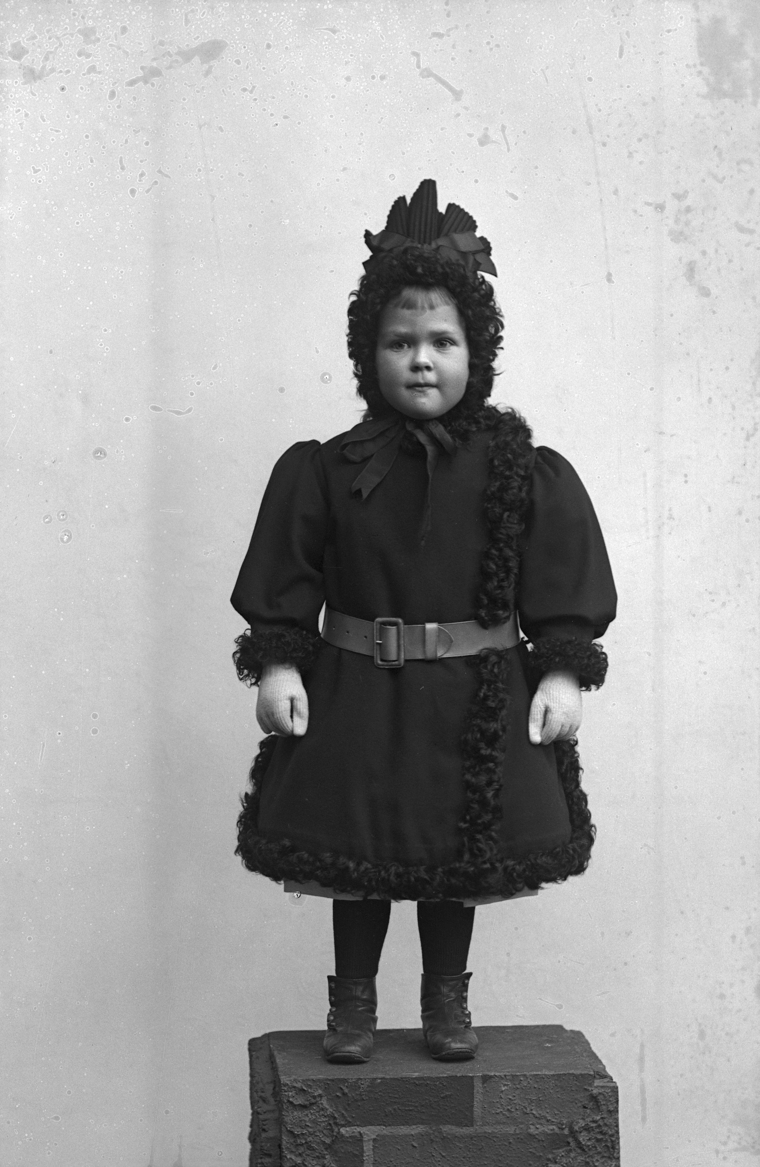 Porträtt i helfigur av Dagmar Ödman, iklädd ytterkläder, stående på stol.