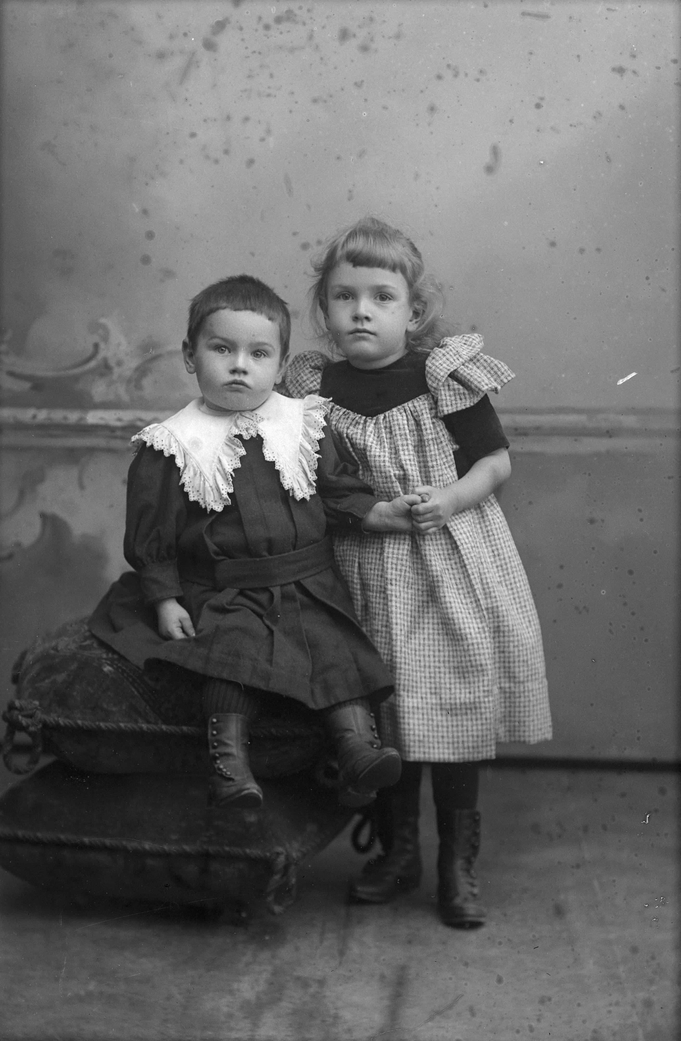 Porträtt i helfigur av Margret och Peter Andrew Fries, hållande hand. Brodern sittande på dyna, systern stående.
