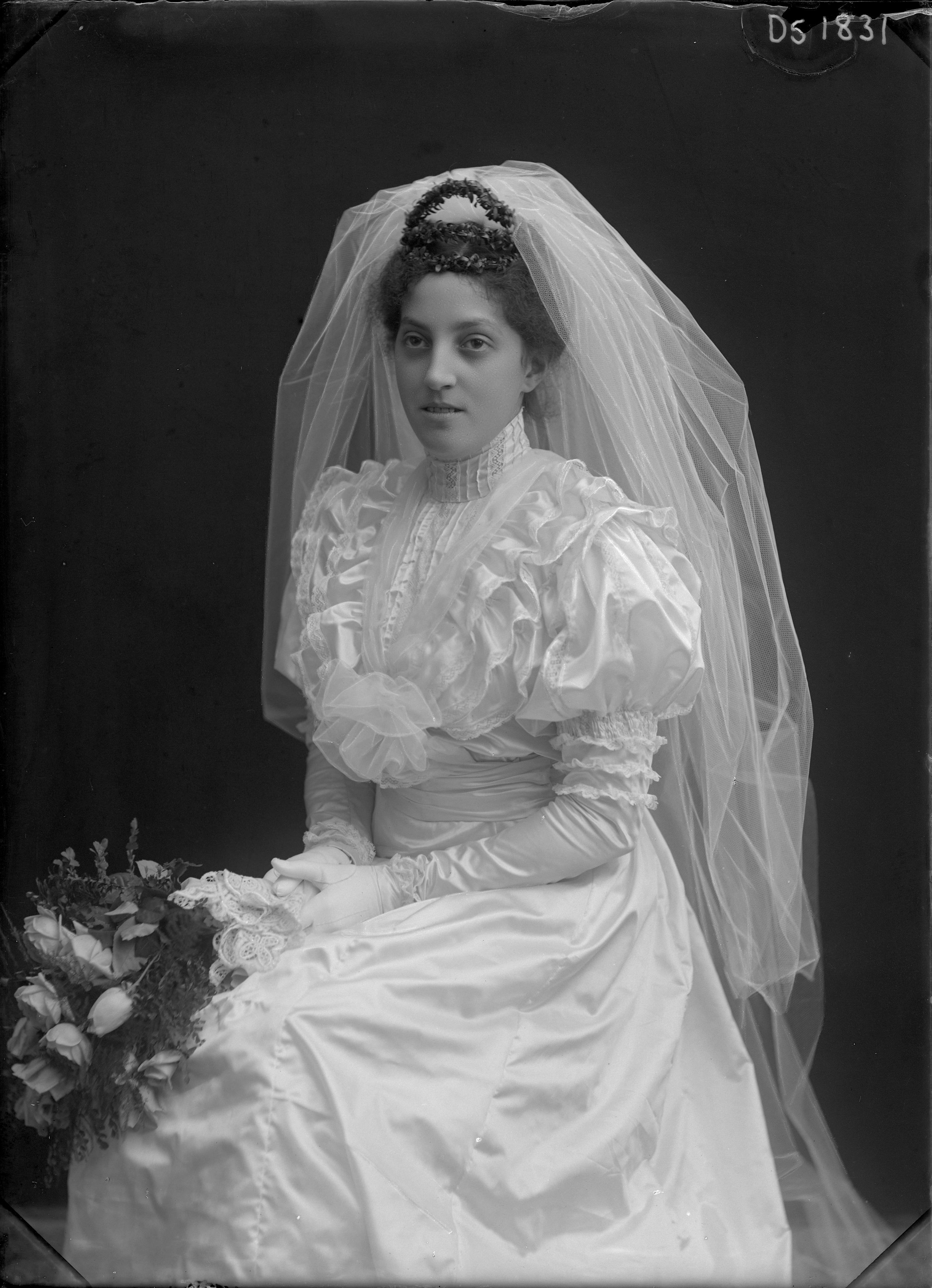 Porträtt i helfigur av Rakel Margolinsky som brud.