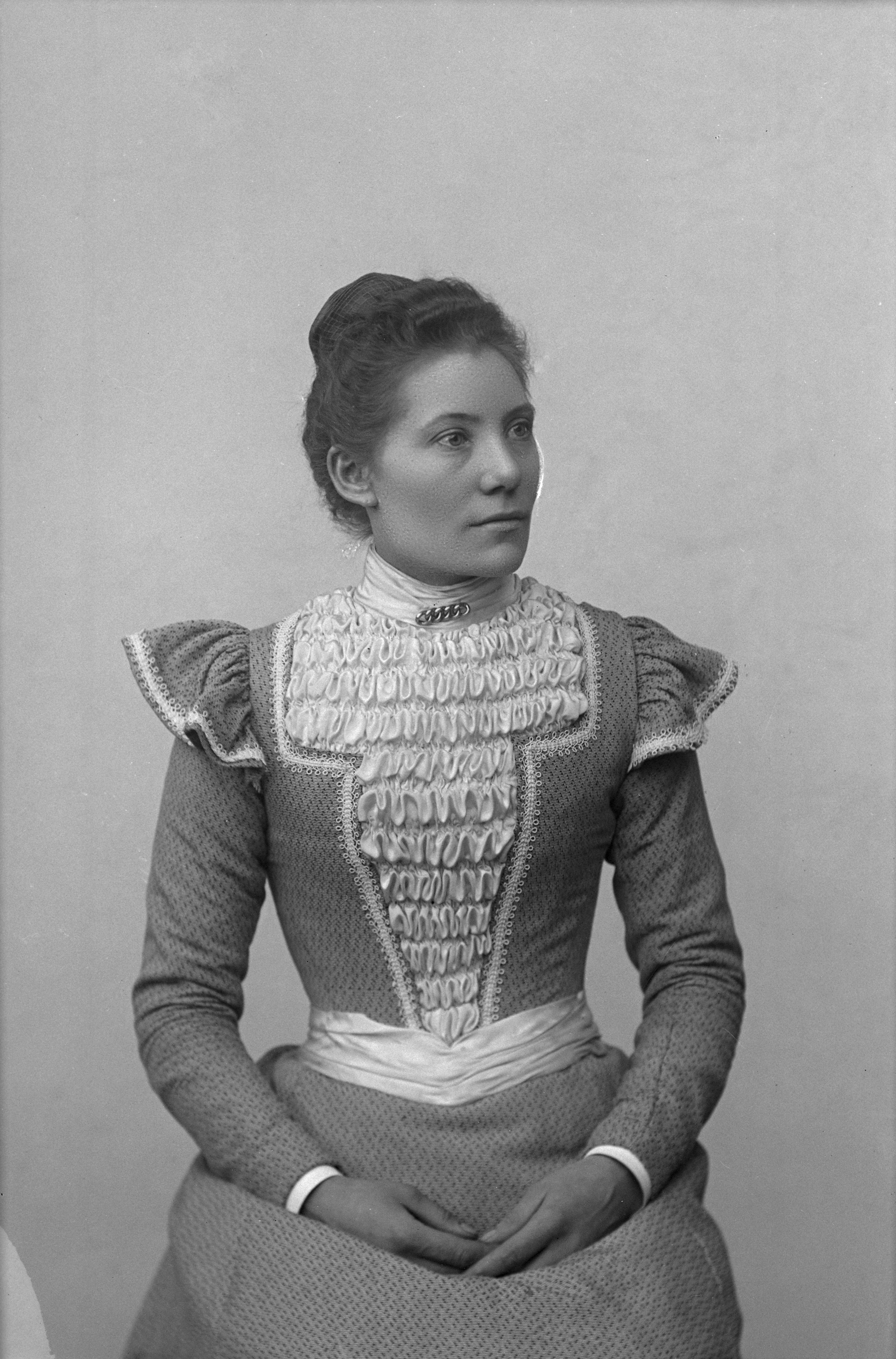 Porträtt i halvfigur av Kersti Nihlén, född Nilsdotter. Gift 1889 med snickaren Nils Nihlen (1860-1950).