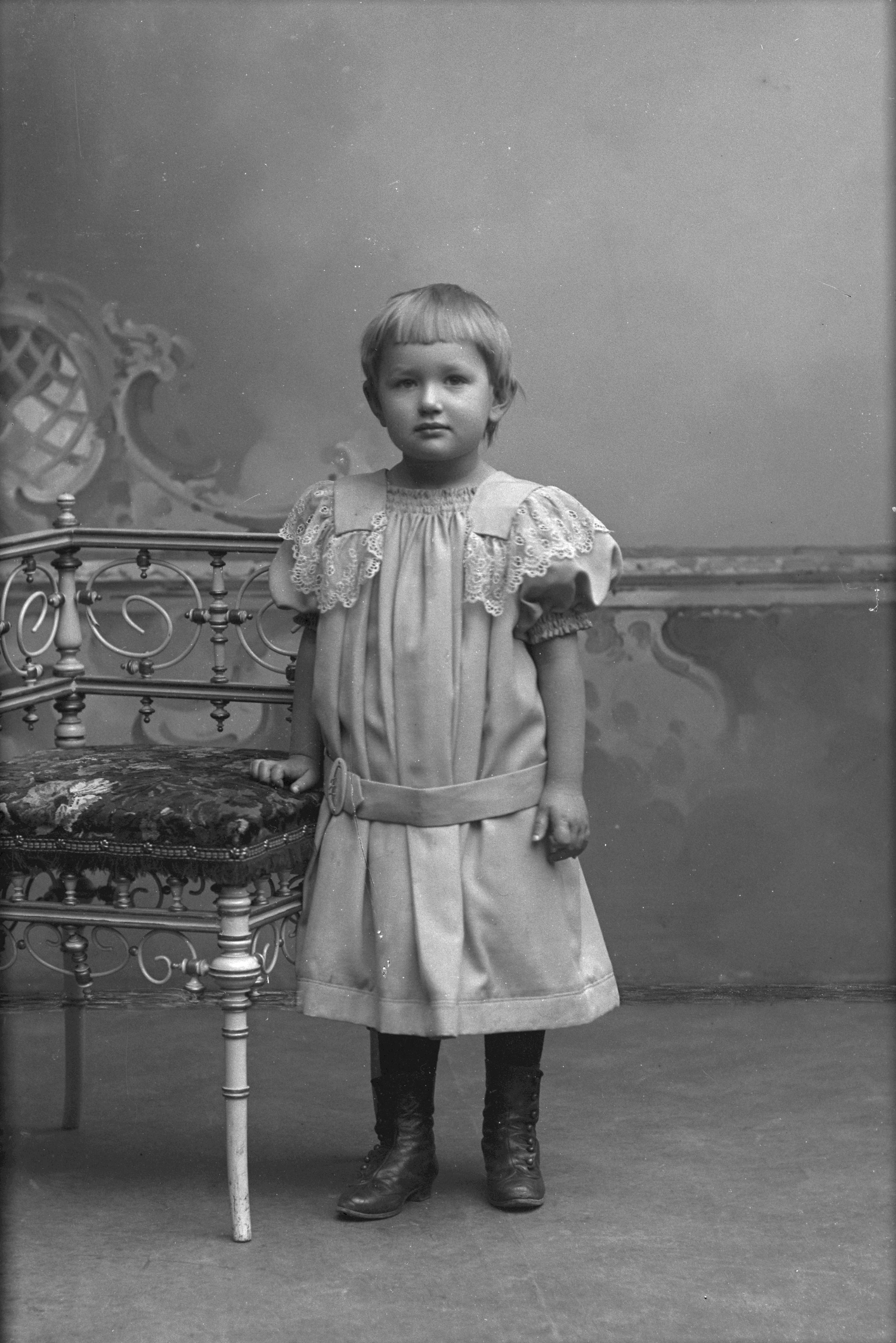 Porträtt i helfigur av Larssons dotter, stående vid stol.